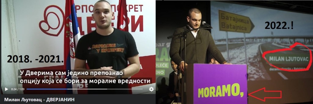 Zbog čega je podivljao lažni ekolog Milan Ljutovac? Radi se o tome da je Ljutovac 4 godine bio član i funkcioner desničarske stranke „Dveri“. Bio je član „Dveri“ 2018., 2019., 2020. i 2021. godine. Ljutovac je 4 godine bio ekstremni desničar, vernik, ljotićevac, bio je proruski i antievropski nastrojen, bio je protiv lažne države Kosovo, nosio je majicu „Dogodine u Prizrenu“ i voleo je Dimitrija Ljotića. Pre 4 godine bio je kandidat „Dveri“ za odbornika u Skupštini Beograda. Dok je bio u „Dverima“, Ljutovac je bio veoma aktivan, o čemu postoje i video snimci. Tako je u jednom promotivnom spotu „Dveri“, rekao: „U Dverima sam jedino prepoznao opciju koja se bori za moralne vrednosti“.