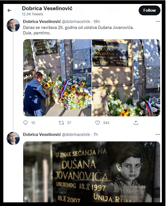 Juče je Dobrica Veselinović, lider stranke „Ne davimo Beograd“ na svoj Tviter, postavio post „Danas se navršava 25. godina od ubistva Dušana Jovanovića. Dule, pamtimo“ i fotografije spomen tabli Dušanu Jovanoviću. Vrlo licemerno. Možda pokajnički? Dobrica Veselinović je više godina, a sve do 2000. godine, bio skinheds. Kao takav, 2000. godine je nastupio u spotu neonacističke skinheds grupe „COKULE“. Ono što Veselinović krije i ne stavlja u svoju biografiju, je činjenica da je bio neonaci skinheds i da je zbog toga „glumio“ u spotu benda „COKULE“. Tako je voditeljka TV „Euronews Srbija“ Minja Miletić, gde je Veselinović gostovao 11.02.2022. jasno rekla da pesma „Šljam“, Veselinovićeve grupe „Cokule“, poziva na svaku vrstu nacinalne i verske mržnje. Citiram Minju Miletić i njeno pitanje Veselinoviću: „Znate zašto vas to pitam? Ne znam da li ste imali priliku da vidite, ali to se deli po društvenim mrežama. Ako neko vidi Dobricu Veselinovića koji ima uverenje da je ekolog, urbanista, u spotu benda „Cokule“ koji je ekstremno desničarski bend i koji poziva na svaku vrstu nacinalne i verske mržnje… Možete li mi objasniti odakle vi u tom spotu?“. Veselinović na to odgovara nevešto vrdajući: „To nije ta pesma. Vi ste krivo informisani. To je nešto što se širi društvenim mrežama, što je očigledno podmetačina. To nije taj spot u kom sam bio“. Minja Miletić: „Ali, videli smo vašu fotografiju?“. Veselinović ipak priznaje: „To je spot u kojem sam ja glumio. Ljudi glume u spotovima. Stvarno, ne bih to komentarisao. Ovo je bio početak 2000ih, ja sam tada imao 19 godina“. I onda se Dobrica Veselinović usuđuje da piše otužne i demagoške postove na Tviteru: „Dule, pamtimo“. I mi Dobrice, pamtimo. Juče, na godišnjicu ubistva, moj kolega uvaženi poslanik Goran Vesić je podsetio na ubistvo dečaka Dušana Jovanovića, tekstom u cenjenom listu „Informer“.
