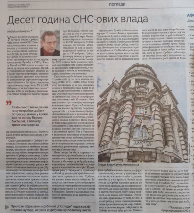 Uskoro će biti izabrana četvrta Vlada Srbije, čiji temelj čini SNS. Glavni oslonac ovim vladama i narodu, u deceniji iza nas, je bio predsednik Aleksandar Vučić. Za ovih 10 godina Srbija je doživela potpunu transformaciju zahvaljujući predsedniku Vučiću i SNS-u. Kada su Vučić i SNS došli na vlast, zatekli su zemlju koja odumire. Vučić je stabilizovao državu, uspustio se u borbu protiv korupcije, obnovio je najvažnije državne institucije, uspostavio je strateško partnerstvo sa Kinom i Rusijom, a nastavio strateško partnerstvo sa EU i SAD. Izborio se za dostojanstvo „malog“ čoveka. SNS je izgradila reputaciju i stekla poverenje birača upravo na ekonomskim reformama, borbi za KiM, borbi protiv kriminala i korupcije. Stanje demokratije u Srbiji u poslednjih 10 godina ukazuje na slobodu medija, na snažne i stabilne institucije, nezavisno pravosuđe. Niz godina unazad većina makroekonomskih kretanja u Srbiji je pozitivna. Stabilizovane su javne finansije. Srbija se transformisala iz ekonomije koju je karakterisala stagnacija rasta i visoka stopa nezaposlenosti – u rastuću ekonomiju sa eliminisanim fiskalnim deficitom, opadajućim javnim dugom, smanjenom eksternom neravnotežom, oporavkom tržišta rada, rastom plata i penzija. U poslednje dve godine Srbija je najbrže rastuća ekonomija u Evropi. Nezaposlenost je pala sa 25,9% na ispod 10, a plate i penzije su značajno porasle. Od prosečne plate koja je bila 331 evro, pre 10 godina, stigli smo do toga da će ona u decembru 2023. biti 720 evra. Minimalna zarada je podignuta sa 15.747 din.(2012.) na današnjih 40.000 din. početkom 2022. Otvoreno je ili je postavljen kamen temeljac za više od 250 fabrika. Srbija je lider u regionu u privlačenju stranih direktnih investicija. Do 2025. godine biće uloženo ukupno 14 milijardi evra u razne projekte iz saobraćajne infrastrukture, nove bolnice i škole, za energetiku, za mlade, za pronatalnu politiku.