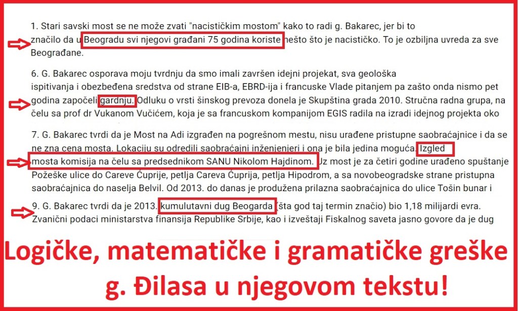 G. Đilas je u žurbi, dok je brojao silne milione evra, napravio mnoge gramatičke, matematičke i logičke greške u tekstu. Da ga podučim. G. Đilas kaže da Beograđani most koriste 75 godina, tj. kaže da je most izgrađen pre 75 godina. I vrapci na grani znaju da je most građen i završen 1942. godine, dakle pre 80 godina. Znaju i vrapci dživdžani, ali ne zna mašinski mozak. Ne piše se „gardnju“ već „gradnju“! Ne piše se „čijii“ već „čiji“. Đilasova rečenica: „Izgled mosta komisija na čelu sa predsednikom SANU Nikolom Hajdinom“ nema nikakav smisao. Šta je g. Đilas želeo da kaže? G. Đilas pominje, piše reči: „kumulutavni dug Beogarda“ i kaže da ne razume šta je to. Ni mi ne razumemo šta je to „kumulutavni dug Beogarda“. Postoji agencija za obezbeđenje koja se zove „Beogard“. „Kumulutavni“ dug je šta? Šta je g. Đilas hteo da kaže? I na kraju savet g. Đilasu – kada pišete neki tekst, kao ovaj odgovor meni, usredsredite se, koncentrišite se samo na to. Nemojte raditi dva posla u isto vreme. Znam da je brojanje 619 miliona naporno, a još je napornije praćenje 53 računa u inostranstvu, u 17 zemalja. Kada površno pristupate pisanju odgovora meni, budite sigurni da ću pronaći sve vaše logičke, matematičke i gramatičke greške, i rastrgnuću vas svojim argumentima. Kao što je sada slučaj.