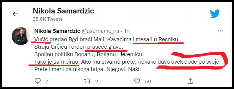 U jeku kampanje mržnje protiv predsednika Vučića, koja dolazi iz Hrvatske, iz lažne države Kosovo, i u jeku otkrića još jednog atentata koji je pripreman protiv predsednika, njegovog sina i brata, profesor Filozofskog fakulteta Nikola Samardžić, danas je putem Tvitera, otvoreno pozvao na ubistvo predsednika Srbije Aleksandra Vučića! Samardžić je na svom Tviter nalogu izneo niz optužbi na račun predsednika Srbije, a na kraju svog izlaganja je poželeo smrt Vučiću rečima „nekako uvek đavo dođe po svoje“. Kao narodni poslanik Skupštine Srbije i član predsedništva SNS, najoštrije osuđujem pretnje ubistvom predsedniku Vučiću.