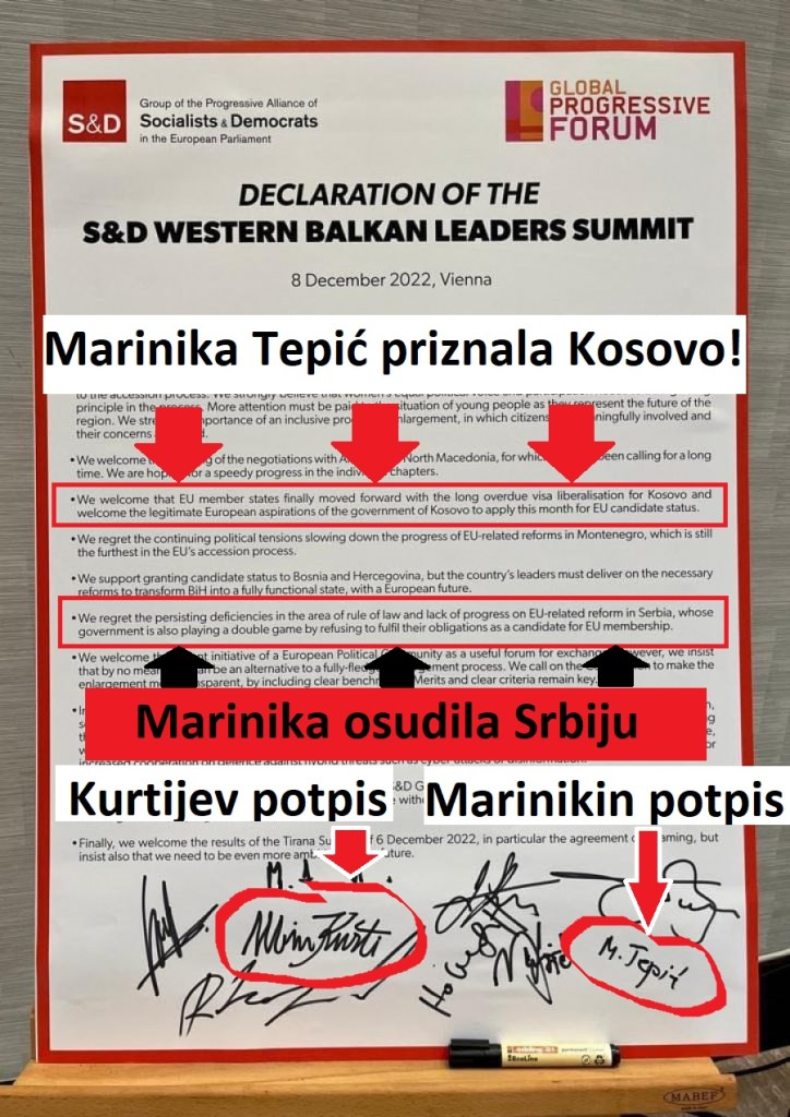 „Progresivna grupa Socijal-demokrata“ u Evropskom parlamentu, objavila je sramnu antisrpsku Deklaraciju nakon održanog Samita te grupacije, u Beču, 8.12.2022. Na tom Samitu su učesvovali i poslanica Marinika Tepić, potpredsednica Đilasove „Stranke slobode i pravde“ (SSP) i poslanik „Demokratske stranke“ Nebojša Novaković. Oboje su potpisali sramnu antisrpsku „Deklaraciju socijal-demokratskog Samita lidera Zapadnog Balkana“. Ta Deklaracija i njeni potpisnici pružaju podršku i „dobrodošlicu legitimnim evropskim težnjama Vlade Kosova da ovog meseca zatraži status kandidata za učlanjenje u Evropsku uniju“.