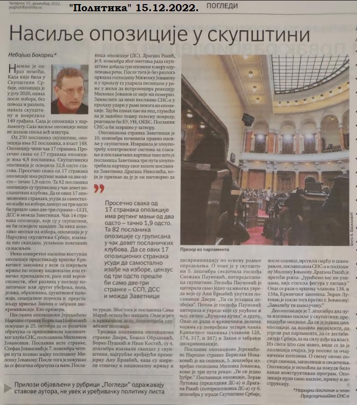 Poslanik opozicione, Jeremićeve Narodne stranke, Borislav Novaković, pokušao je 25.10. da se fizički obračuna sa predsednikom poslaničkog kluba SNS, gospodinom Milenkom Jovanovim. Poslanik iste stranke, Stefan Jovanović je, 7.11., četiri puta, psovao majku gospodinu Milenku Jovanovu. Posle toga je pokušao da se fizički obračuna sa njim. Poslanica opozicije (DS), Dragana Rakić, je 8.11. zbog ometanja rada Skupštine dobila tri opomene i meru oduzimanja reči. Posle toga je bez razloga prišla gospodinu Milenku Jovanovu, i u prolazu ga udarila pesnicom u rame, u želji da isprovocira reakciju. Milenko Jovanov se nije ni pomerio. Zamislite da neki poslanik SNS u prolazu, udari u rame nekoga iz opozicije. Taj bi odmah pao na pod, glumeći da je zadobio tešku telesnu povredu, reagovale bi EU, UN, OEBS. Poslanik SNS bi završio u zatvoru.