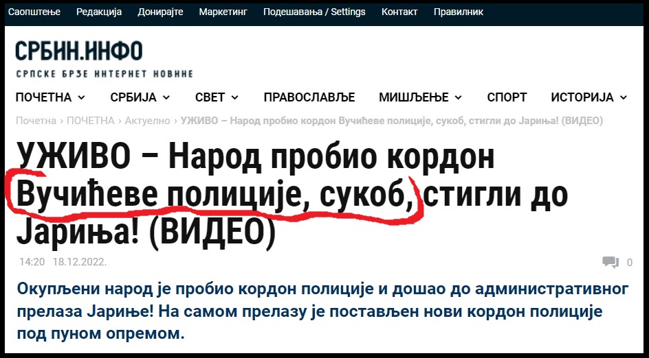 „N1“ je objavila vest „Protest desničara kod Jarinja, KFOR postavio žicu, skup obezbeđuje i MUP“. „NovaS“ je objavila vest „KFOR postavio bodljikavu žicu na Jarinju, policija zaustavila desničare na 100 metara od prelaza“. „Danas“ je objavio vest „Stotinak građana protestuje na Jarinju: Došlo do incidenta, probijen jedan kordon srpske policije“. Sva tri tajkunska medija su preuzimala medijski materijal sa ekstremističkog desničarskog sajta „Srbininfo“. Zanimljivo je da tajkunski antisrpski mediji, bez problema sarađuju sa ekstremno desničarskim navodno patriotskim medijima, i obrnuto. Povezuju ih dve stvari. Mrze predsednika Vučića, i rade protiv Srbije. Ekstremistički sajt „Srbininfo“ je objavio tekst „Narod probio kordon Vučićeve policije, sukob, stigli do Jarinja“.