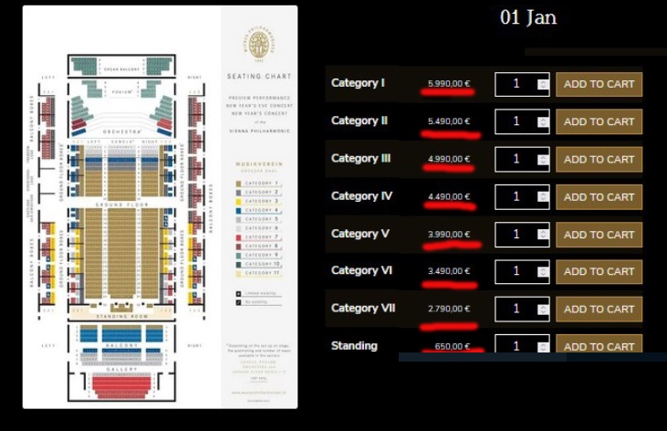 Cene karata za Novogodišnji koncert Bečke filharmonije su ogromne. Na sajtu Bečke filharmonije, već godinama stoji da cene karata za Novogodišnji koncert iznose 1200 evra. Međutim to je cena onih karata koje se izvlače žrebom isključivo na sajtu Bečke filharmonije. Malobrojni srećnici onda te karte moraju da plate „tričavih“ 1200 evra.