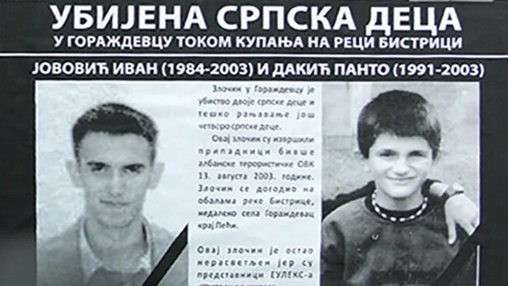 Pucali su isti oni što su pucali na srpsku decu na reci Bistrici u Goraždevcu 2003. Pucali su isti oni što tada ubiše Ivana Jovovića i Pantu Dakića! Pucali su isti oni što raniše Marka Bogićevića, Draganu Srbljak, Bogdana Bukumirića i Đorđa Ugrenovića!