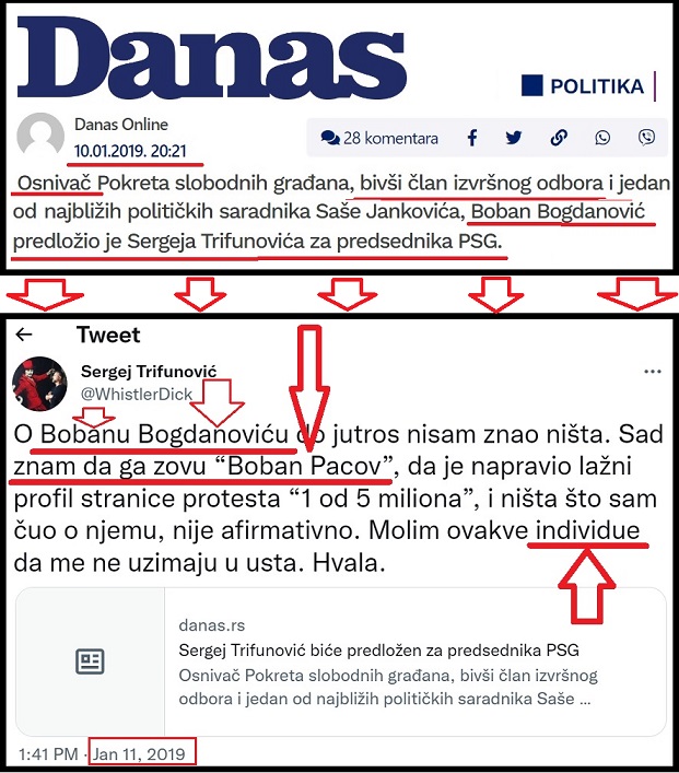 Boban Bogdanović, za koga Sergej Trifunović tvrdi da ga zovu „Boban pacov“ je poznat po tome što je lagao o ubistvu Olivera Ivanovića. U svom lažnom iskazu „KRIK“-u, 29.3.2022., Boban Bogdanović je tvrdio da je Ivanovića ubio Ljubomir Lainović i rekao doslovce: „Olivera Ivanovića je ubio Ljubomir Lainović, sin nekada žestokog novosadskog momka Branislava Lainovića“. Pre mesec dana na KZŠ u Prištini, Boban Bogdanović, je uskočio sam sebi u usta, i pokazao koliki je lažov. Bogdanović je promenio iskaz i tvrdio da je Ivanovića ubio član kavačkog klana, pod nadimkom „Crnogorac“, a ne Ljubomir Lainović! Pre mesec dana Bogdanović je rekao: „Direktni izvršilac ubistva Olivera Ivanovića je član kavačkog klana čiji je nadimak Crnogorac. Lainović nije bio taj koji je pucao“. Ovo pokazuje koliko vredi reč Bobana Bogdanovića, lažnog svedoka i novopečenog Kurtijevog sluge. O opskurnosti Bobana Bogdanovića svedoči i to da on sebe opisuje kao biznismena koji razvija i prodaje firme (neistina). Bogdanović je tada tvrdio da se bavio i politikom, i tvrdio je da je bio član  PSG u vreme Saše Jankovića (istina). O tome ko je Boban Bogdanović najbolje svedoči Sergej Trifunović 11.01.2019. godine, na Tviteru: „O Bobanu Bogdanoviću do jutros nisam znao ništa. Sad znam da ga zovu “Boban Pacov”, da je napravio lažni profil stranice protesta “1 od 5 miliona”, i ništa što sam čuo o njemu nije afirmativno. Molim ovakve individue da me ne uzimaju u usta“.