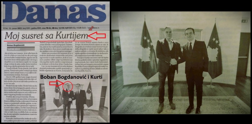 Danas je u Šolakovom tajkunskom malotiražnom listu „Danas“ na celoj stranici objavljen tekst opskurnog Kurtijevog sluge, Bobana Bogdanovića, pod naslovom – „Moj susret sa Kurtijem“. U tom tekstu Bogdanović se besramno hvali svojim susretu sa Aljbinom Kurtijem, koji se odigrao 04.01.2023. godine. O tom susretu svedoči tekst na albanskom portalu „Insajderi“, pod nazivom „KURTI TAKOI ‘FSHEHTAS’ POLITIKANIN KONTRAVERS SERB, BOBAN BOGDANOVIQ“. Tekst u „Insajderi“-ju govori o zajedničkom susretu Aljbina Kurtija, njegovog lažnog ministra Nenada Rašića i Bobana Bogdanovića.
