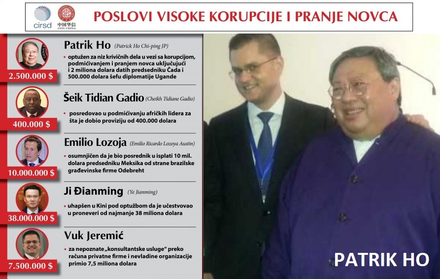 Patrik Ho Ći Ping (73), po obrazovanju očni hirurg, oftalmolog, je političar i biznismen iz Hong Konga. Bio je ministar unutrašnjih poslova Hong Konga 2002. Kompaniji „CEFC China Energy Company Limited“, se pridružio 2007. godine. Kasnije je vodio kompanijinu NVO CEFC. Osuđen je u SAD, 5.12.2018. na tri godine zatvora, zbog pranja novca i davanja mita. Protiv Hoa, na suđenju, svedok saradnik je bio Čejk Tidijan Gađio, takođe saradnik Vuka Jeremića. Kineski medij „South China Morning Post“ je 9.6.2020. izvestio da je Patrik Ho odslužio kaznu, i da je 8.6.2020. deportovan iz SAD u Hong Kong. Ho je bio veoma blizak Vuku Jeremiću – bio je član borda Jeremićeve NVO CIRSD.