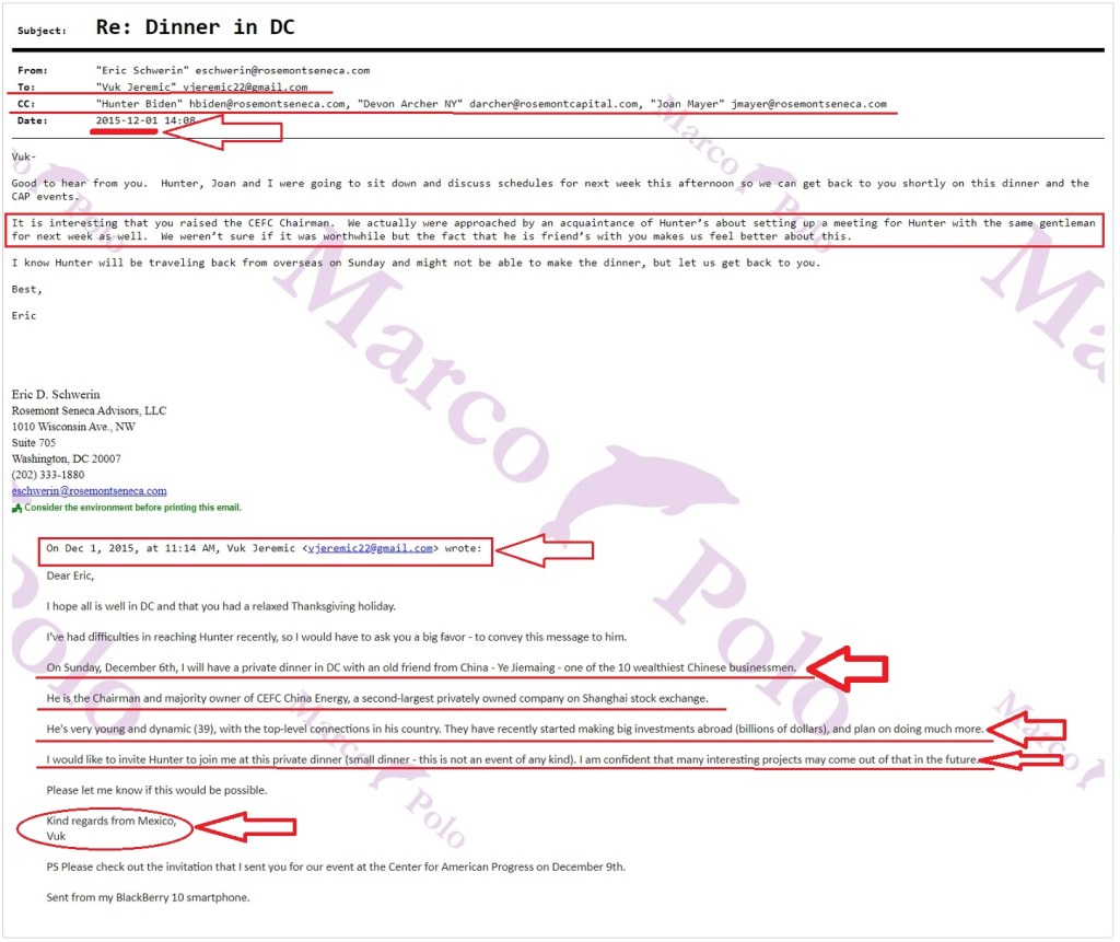 Tu na scenu stupa Vuk Jeremić. „Vašington post“ kaže: „CEFC-ov posrednik, je u decembru 2015. kontaktirao Hantera Bajdena, sa predlogom da se sretne sa Ji Đianminom, osnivačem i predsedavajućim kineske kompanije. Vuk Jeremić, srpski političar, koji je bio predsedavajući Skupštine UN, napisao je u mejlu mlađem Bajdenu, da organizuje malu privatnu večeru u Vašingtonu, sa Jiem – koga je nazvao „jedan od 10 najbogatijih kineskih biznismena“, i da želi da Hanter takođe prisustvuje, napisao je Jeremić 1.12.2015. u mejlu“. Do tog susreta Bajdena i Đianminga tada nije došlo.