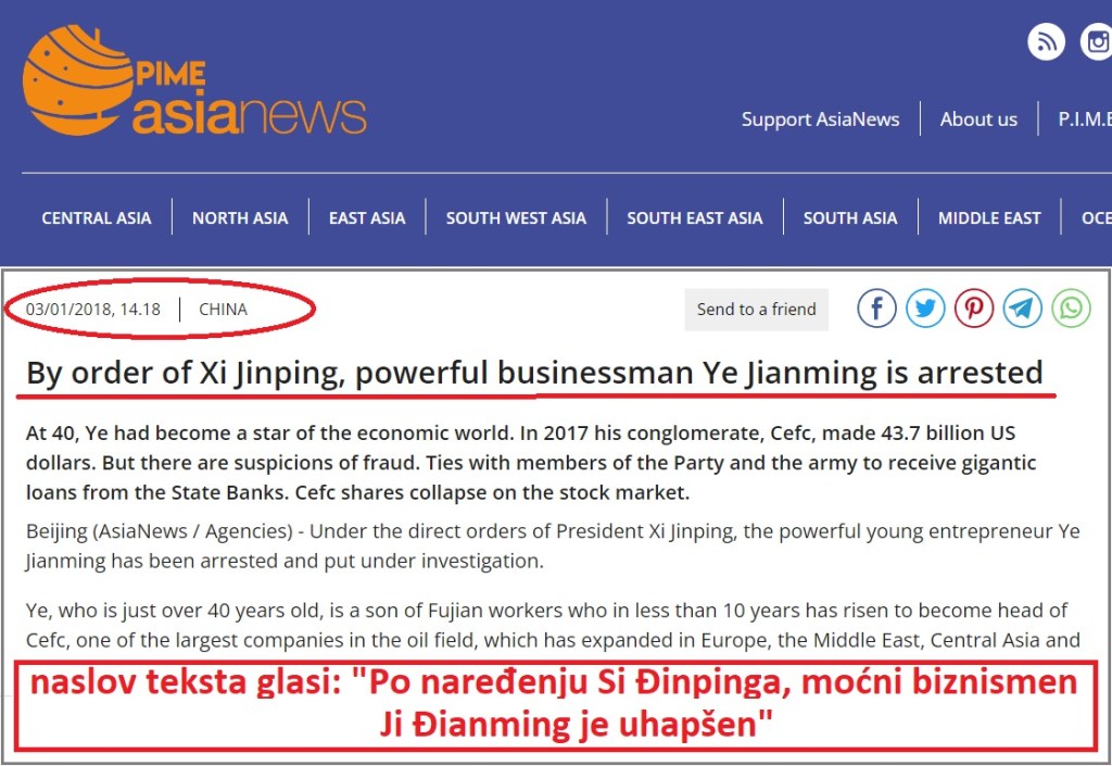 Ji Đianmin (45) je osnivač i bivši šef „CEFC China Energy Company Limited“, ugašene, tj. preuzete kompanije. CEFC je progutala kompanija „Shanghai Guosheng Group“. Opšte je poznato da kineske vlasti vode bespoštednu borbu protiv korupcije. Đianmin je uhapšen zbog pronevere 38 miliona dolara, u martu 2018. po direktnom naređenju kineskog predsednika Si Đinpinga, kako su izvestili kineski mediji („South China Morning Post“ i „AsiaNews“). Tekst u „AsiaNews“ od 1.3.2018. je glasio: „By order of Xi Jinping, powerful businessman Ye Jianming is arrested“ – „Po naređenju Si Đinpinga, moćni biznismen Ji Đianming je uhapšen“. Vidi link „AsiaNews“ https://www.asianews.it/news-en/By-order-of-Xi-Jinping,-powerful-businessman-Ye-Jianming-is-arrested-43239.html Ji Đianming (Ye Jianming) je optužen i za „ekonomske zločine“ (zločin protiv kineske države) i za korupciju. Pre preuzimanja tj. gašenja, CEFC je bio rangiran na 229 mestu liste „Fortune Global 500“ 2016. godine. Zahvaljujući Ji Đianmingu, „CEFC China Energy Company Limited“, je ranije osnovao svoju NVO „CEFC“ u Hong Kongu („think tank“). Ji Đianmin je na listi „Fortune magazine’s “40 Under 40”“ bio rangiran kao drugi. Lista je rangirala najuticajnije mlade ljude u svetu 2016. godine.