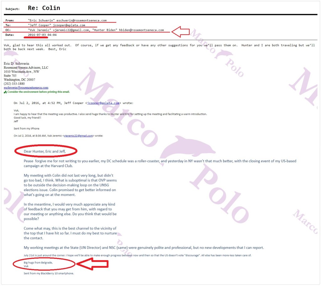 Vesti ova dva američka medija govore da je lider Narodne stranke, Vuk Jeremić, tokom 2015. i 2016. često kontaktirao zvaničnike SAD, zadužene za bezbednost i odbranu, u vrhu establišmenta. Pokušavao je da obezbedi podršku potrebnu za izbor na funkciju generalnog sekretara UN. Zbog toga je Jeremić kontaktirao Hantera Bajdena, njegovog brata i druge zvaničnike. Zauzvrat Jeremić je nudio unosnu poslovnu saradnju sa svojim prijateljem i glavnim finansijerom, moćnim kineskim tajkunom, Ji Đianmingom, tada predsednikom kineske kompanije „CEFC China Energy Company Limited“, koja je širila svoj posao na zapadu. Đianming je želeo da razgrana svoj biznis u SAD, i za to je obezbedio posredničku pomoć Vuka Jeremića, koga je obilno finansirao (7,5 miliona dolara). Hanter Bajden je u Jeremićevu korist, zatražio pomoć od savetnika za nacionalnu bezbednost Kolina Kala, koji je tada bio savetnik potpredsednika SAD, Džoa Bajdena. Kal je sada podsekretar odbrane za politiku u Pentagonu. Tražili su način kako da pomognu Vuku Jeremiću, da postane generalni sekretar UN, navode američki mediji. U julu 2016. Hanter Bajden je ugovorio sastanak Vuka Jeremića i Kolina Kala.