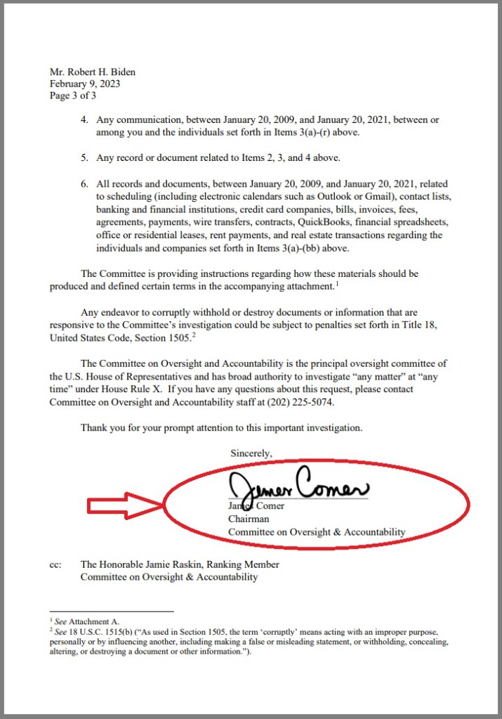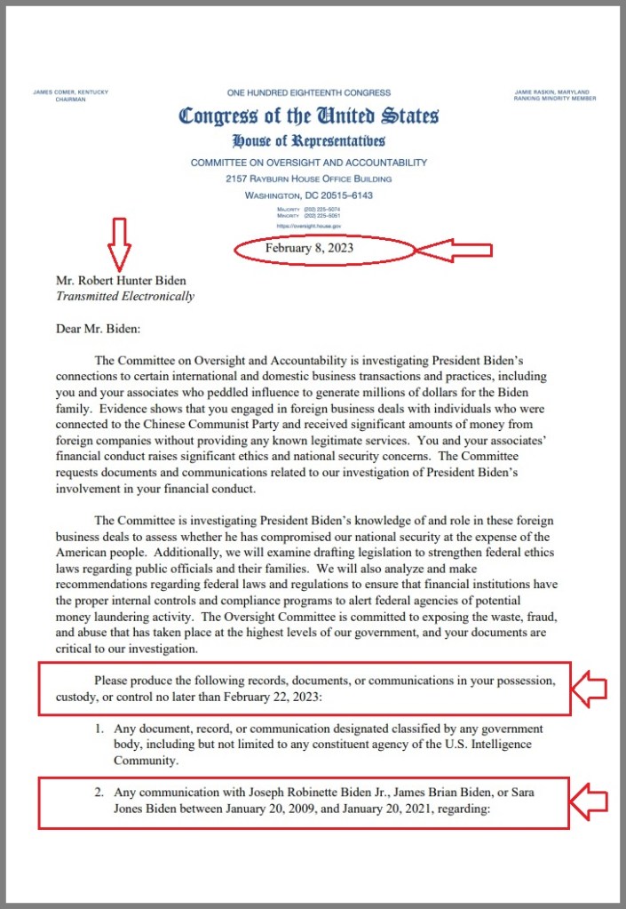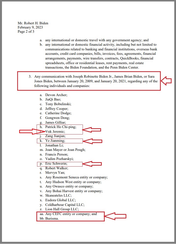 U pismu (zahtevu) Hanteru Bajdenu od 8.2.2023., predsednik kongresnog Odbora za nadzor i odgovornost, Džejms Komer traži podatke o povezanosti porodice Bajden sa aktivnostima u Ukrajini, Kini i drugim zemljama, i u pismu stoji: „Komitet za nadzor i odgovornost istražuje slučaj predsednika Bajdena. Veze sa određenim međunarodnim i domaćim poslovnim transakcijama i praksama, uključujući vas i vaše saradnike koji su prodavali uticaj kako bi generisali milione dolara za porodicu Bajden. Dokazi pokazuju da ste učestvovali u stranim poslovima sa pojedincima koji su bili povezani sa Kinom i primali značajne sume novca od stranih kompanija bez pružanja bilo kakvih poznatih legitimnih usluga“. Od Hantera Bajdena, Odbor Senatora Komera traži da dostavi sva raspoloživa dokumenta, izvode, zapise, komunikaciju (mejlove, poruke) sa Džozefom Bajdenom, Džejmsom Bajdenom i Sarom Bajden, od 20.1.2009. do 20.1.2021., koja se tiče niza pojedinaca i kompanija – njih 28 na spisku od „a“ do „z“. Među njima su (pod „h.“ Patrick Ho Chi-ping; pod „i.“ Vuk Jeremic; pod „k.“ Ye Jianming; pod „p.“ Eric Schwerin; i pod „aa.“ „CEFC entity or company“(CEFC ili neki njegov deo) najkasnije do 22.2.2023. Tražene informacije se odnose i na CEFC-ov konsultantski aranžman od 5 miliona dolara sa Hanterom Bajdenom i na dodatnu isplatu od milion dolara koju je Hanter Bajden primio za zastupanje Patrika Hoa, nekadašnjeg izvršnog direktora CEFC-a. Za isti posao zastupanja Patrika Hoa, tj. CEFC-a je bio angažovan i Vuk Jeremić. Pomoćnik iz Komerove kancelarije rekao je medijima: „Vuk Jeremić je povezan sa poslovnim poslovima Hantera Bajdena i verovatno poseduje ključne informacije”. Tako je razmišljao i sud u Njujorku. Na suđenju Patriku Hou, 27.11.2018., kao prvi svedok u sudu u Njujorku, svedočio je Vuk Jeremić.