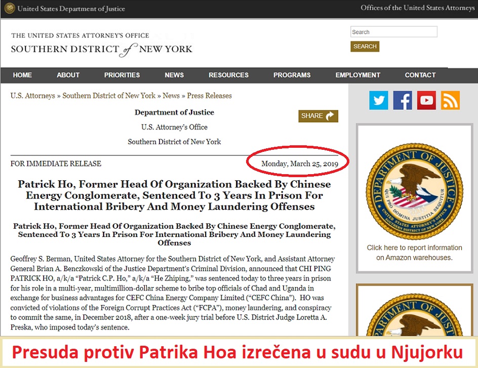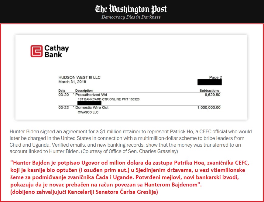 U međuvremenu, američki federalni istražitelji su nadzirali Patrika Hoa. Hanter Bajden je 22.9.2017. potpisao ugovor vredan milion dolara, da kao advokat, zastupa Hoa, u SAD. Patrik Ho je uhapšen 18.11.2017. od strane agenata FBI na aerodromu JFK. Raspad je počeo ubrzo. Kako je Ho bio u zatvoru, Ji, glava CEFC-a, je pritvoren u Kini, sredinom februara 2018., zbog sumnje za privredne zločine“. Ovaj izveštaj „Vašington posta“ je od izuzetnog značaja!