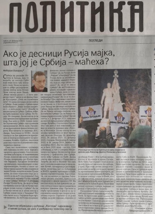 Svih pet političkih grupacija, već godinama ističu svoju izrazitu prorusku orijentaciju. Hvale se kontaktima sa Rusijom, sa zvaničnicima Rusije, pokazuju filmove o posetama Rusiji, podržavju rat Rusije protiv Ukrajine. Proruske političke organizacije, parlamentarne i vanparlamentarne, se toliko hvale ljubavlju prema majci Rusiji, podrškom majci Rusiji, podrškom majke Rusije njima, da svako normalan mora da se zapita da li ih Rusija podržava? Ako toliko vole majčicu Rusiju, šta im je onda Srbija? Maćeha? A šta kaže Rusija? Rusija ćuti. Da li je to znak odobravanja ili ne? Da li Rusija podržava Desni sektor u Srbiji? Da li je Rusija svesna da je Desni sektor u Srbiji jednak onom u Ukrajini? Rusija tvrdi da se u Ukrajini bori protiv fašizma. Da li Rusija podržava fašizam Desnog sektora u Srbiji? Da li Rusija želi „Majdan“ u Beogradu? Da li Rusija želi da destabilizuje jedinu državu u Evropi, koja joj nije uvela sankcije? Da li je to hvala Srbiji? Da li Rusija podržava uklanjanje predsednika Srbije, koji je glavni tvorac politike protivljenja sankcijama Rusiji? Da li je to hvala Vučiću? Ceo svoj život sam nenaklonjen Zapadu. Međutim, nisam slep da ne vidim da u poslednjih godinu dana Zapadu ne odgovara nestabilna Srbija. Zapad želi stabilnu Srbiju! Da li Rusiji odgovara stabilna ili nestabilna Srbija? Da li Rusiji odgovara ukrajinizacija Srbije? Desni sektror je 2.2.2023. pokušao da linčuje predsednika Srbije, Aleksandra Vučića u Skupštini Srbije, zbog toga što je pun poštovanja, došao da izvesti najviši dom o Kosovu i Metohiji. Desni sektor za dva meseca organizovao šest propalih skupova (Beograd 16.12.2022.; 28.1.2023.; 15.2.2023., Severna Mitrovica 8.1.2022. i 28.1.2023., Jarinje 18.12.2022.). Na tih šest skupova je bilo 1620 ljudi – od toga 1300 u Beogradu, a 320 u Severnoj Mitrovici i na Jarinju. Desni sektor nema podršku u građanstvu uže Srbije, niti među Srbima na KiM. Desni sektor ima podršku u Prištini i Zagrebu. Da li i u Moskvi? Na svih 6 skupova satanizovan je predsednik Vučić, zagovarana je ratnohučkačka politika, rat sa Albancima i NATO, prekid pregovora o KiM, prekid evrointegracija. Kao i Kurti, svi desničari se protive „Zajednici srpskih opština“, „Briselskom sporazumu“ i novom predlogu EU. Na šestom skupu, za Dan državnosti, Desni sektor je napao Predsedništvo i pokušao državni udar. Pretili su smrću predsedniku i rekli su da su spremni na mnogo gore stvari od izazivanja nereda. Spremni su da ruše Srbiju, da ruše poredak, spremni su da ubijaju. Kažu – zbog ljubavi prema Kosovu i Metohiji i prema Rusiji. Neće biti. Pre se radi o tome da žele da dođu na vlast nasiljem, bez izbora, u krvi. Pri tome Desni sektor otvoreno kaže da im ne smeta da se udruže sa prozapadnim Levim sektorom, da bi srušili predsednika Vučića. Da je Desnom sektoru stalo do KiM, kao do lanjskog snega, dokazuje to što prema Srbiji i Vučiću vode jednaku politiku kao i Aljbin Kurti. Politici Desnog sektora u Srbiji, najviše se raduju u Prištini i Zagrebu.