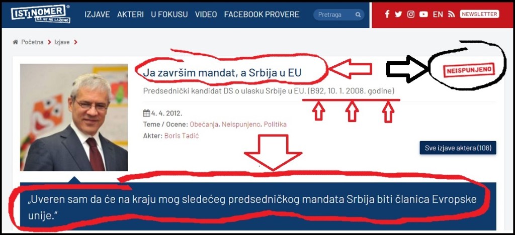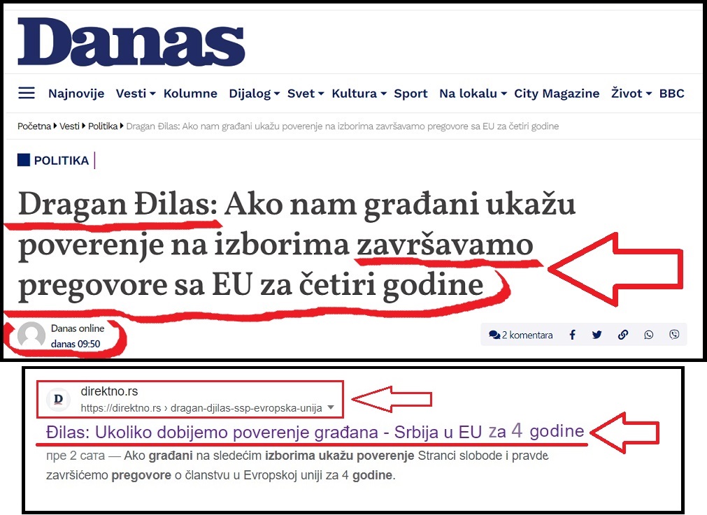 Đilas je nastavio sa lažnim obećanjima i danas, 28.3.2023. godine, kada je u emisiji „Probudi se“ na TV Nova saopštio: „Ukoliko dobijemo poverenje građana – Srbija u EU 2030“. Tako je glasio i naslov vesti na Đilasovom portalu „Direktno“. Đilas je tačno rekao: „Ako građani na sledećim izborima ukažu poverenje Stranci slobode i pravde završićemo pregovore o članstvu u Evropskoj uniji za 4 godine. Nakon toga biće potrebne još dve godine za ratifikacije ugovora o pristupanju u parlamentima EU, što znači da će Srbija postati član Unije 2030. godine“.