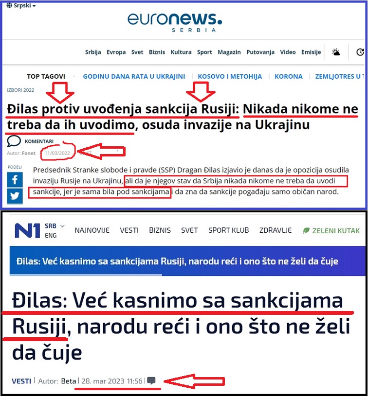 Dragan Đilas, nastavljajući svoj intervju, konstantno obmanjuje javnost u vezi pitanja uvođenja sankcija Rusiji i kaže da po pitanju uvođenja sakcija Rusiji, ako želimo da napredujemo, moramo uvesti delimične sankcije Ruskoj Federaciji. Tačno je da je vlast odbila da uvede sankcije Rusiji. Međutim Đilas, krije, a time obmanjuje javnost, da su upravo on i njegova stranka- SSP, odlučno bili protiv uvođenja sankcija Rusiji, do 4.4.2023., dok je trajala izborna kampanja. Đilas je 11.3.2022. na TV „NovaS“ oštro izjavio: „Srbija nikada nikome ne treba da uvodi sankcije, jer je sama bila pod sankcijama i zna da sankcije pogađaju samo običan narod“. Kako je prestala potreba da SSP obmanjuje građane u kampanji, Đilas je obrnuo ploču i počeo da zagovara uvođenje sankcija Rusiji. Ponoviću, Đilas je u martu 2022. rekao da „Srbija nikada nikome ne treba da uvodi sankcije“. Zbog čega je slagao, i promenio stav? I primetiću, da je i ovom novom izjavom o uvođenju „delimičnih sankcija Rusiji“, Đilas još jednom pokazao prevrtljivost, i nedoslednost, jer su do juče on i SSP, govorili o punim sankcijama Rusiji, tj. o potpunom usaglašavanju sa politikom EU. Sada odjednom, Đilas prvi put pominje „delimične sankcije Rusiji“. Običan građanin nikako neće moći da shvati šta je politika Dragana Đilasa i SSP, u vezi sankcija Rusiji – protivljenje sankcijama, delimične sankcije ili pune sankcije? Kako to građani da znaju, kada Đilas iznosi treći po redu različit stav po tom pitanju!?!