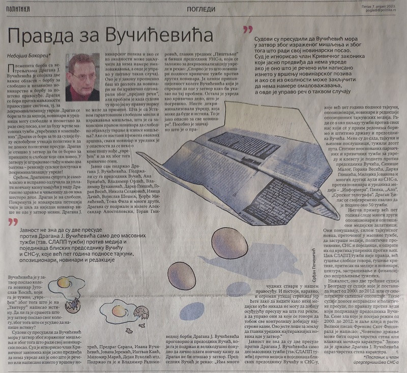 Plemenita borba sa vetrenjačama Dragana J. Vučićevića je spojila dve važne oblasti -borbu za slobodno i nezavisno novinarstvo i borbu za pošteno pravosuđe. Dragan se bori protiv manjkavosti pravosudnog sistema, tj. za dekriminalizaciju uvrede. Dragan se bori za to da mediji, novinari i urednici mogu slobodno i neometano da rade svoj posao, a ne da budu žrtve masovnih tužbi „uvređenih i iznenađenih“. Dragan se bori za to da sudije budu oslobođene uticaja politike, i da ne donose političke presude. Dragan je otišao u zatvor da bi se borio za principe i slobode koje sam naveo. U zatvoru je štrajkovao glađu i imao dva zahteva – reviziju sudskog postupka i dekriminalizaciju uvrede! Srećom, Draganova supruga je samovlasno i ispravno odlučila da uplati novčanu kaznu, imajući u vidu Draganovo zdravlje i činjenicu da on ima šestoro dece. Dragan je na slobodi. Pokrenuta je izvanredna peticija čiji je cilj da nijedan novinar više ne ode u zatvor nevin. Dragana J. Vučićevića su u zatvor poslale kolege novinari Jugoslav Ćosić i Žaklina Tatalović, koji su ga tužili, „uvređeni“ zbog toga što je na Tviteru, napisao istinu o njima. Da li ih je sramota što su u zatvor poslali svog kolegu, zbog toga što se usudio da o njima napiše istinu? Sudovi su presudlili da Vučićević mora u zatvor, zbog izraženog mišljenja, i zbog toga što radi svoj novinarski posao. Sud je ignorisao član Krivičnog zakonika koji jasno predviđa da nema uvrede ako je ono što je rečeno ili napisano izneto u vršenju novinarskog poziva i ako se iz okolnosti može zaključiti da nema namere omalovažavanja, a ovde je upravo u pitanju takav slučaj. Ovo je u zakonu propisano baš iz razloga da novinari ne bi krivično odgovarali zbog „prejake reči“, ali problem je kada sudovi tu vrlo jasnu pravnu normu ne žele da primene. Šta je sa Ustavom garantovanom slobodom misli i izražavanja mišljenja, šta je sa zakonskim pravom novinara da slobodno objavljuju tvrdnje i iznose mišljenja? Ako se nastavi primena ovakvih aršina, svaki novinar i urednik su u opasnosti da se neko o kome pišu nađe „uvređen“ i da ih zbog toga krivično goni.