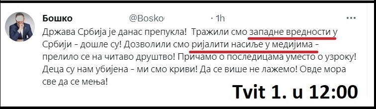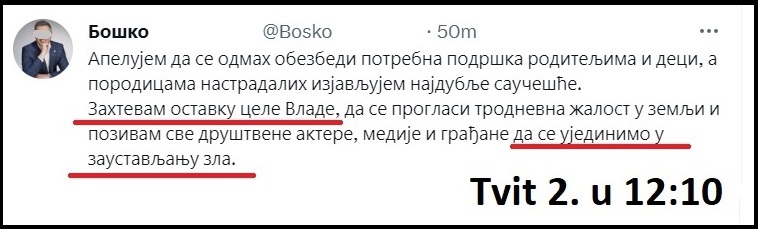 Iz ovog prvog Tvita vidi se šta je Bošku prioritet – lov na veštice, lešinarenje, ubiranje političkih poena. Bošku Ljotiću prioritet nije saučešće, saosećanje, žaljenje, podrška porodicama stradalih, ne nikako. To se vidi i po tome što je Boško naknadnom pameću, deset minuta posle prvog Tvita, objavio i drugi Tvit, gde se setio da treba da uputi saučešće: „Apelujem da se odmah obezbedi potrebna podrška roditeljima i deci, a porodicama nastradalih izjavljujem najdublje saučešće. Zahtevam ostavku cele Vlade, da se proglasi trodnevna žalost u zemlji i pozivam sve društvene aktere, medije i građane da se ujedinimo u zaustavljanju zla“.