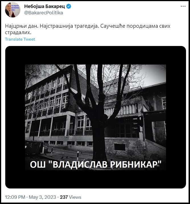 Što se mene tiče ja sam, po saznanju o tragediji na društvenim mrežama objavio sledeće: „Najcrnji dan. Najstrašnija tragedija. Saučešće porodicama svih stradalih“ i zacrnjenu fotografiju škole Vladislav Ribnikar. Još jednom upućujem saučešće porodicama svih stradalih u masakru u OŠ „Vladislav Ribnikar“.