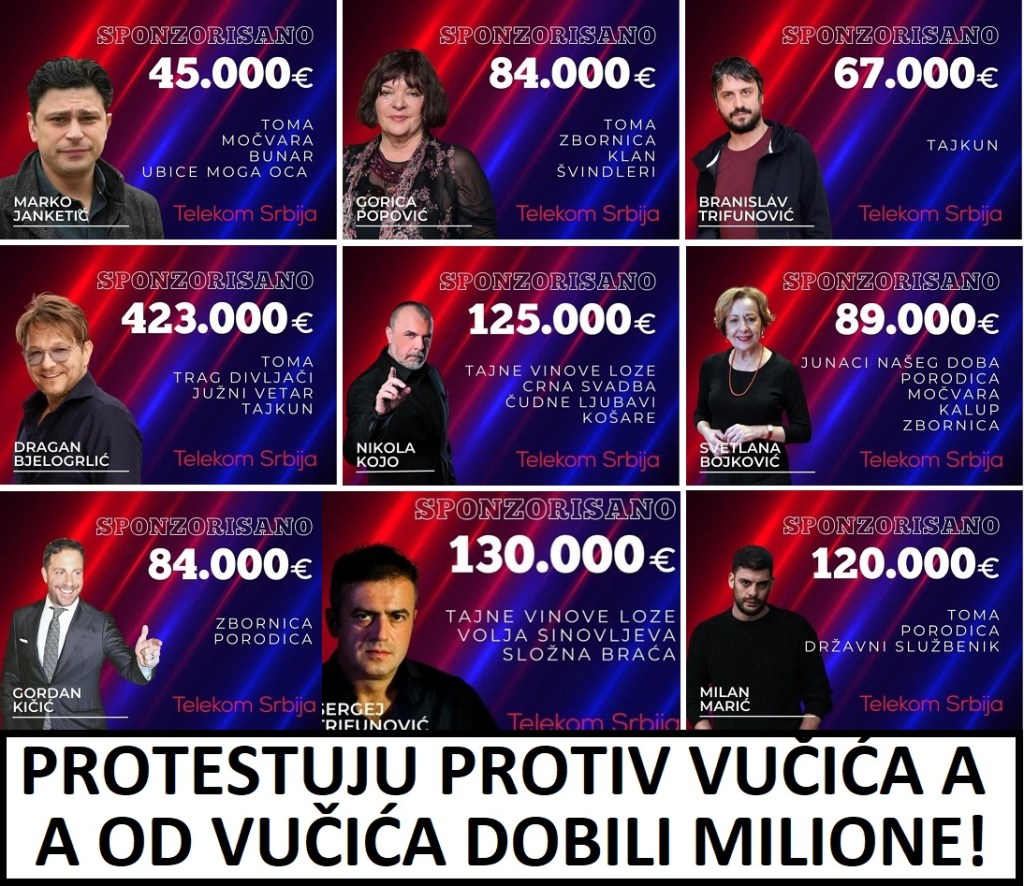 Ti glumci nikada nisu donirali ni dinar, ni evro svojih ogromnih honorara, deci Srbije, ugroženim ženama Srbije, nikada nisu kupili ni jedan respirator, u doba Korone, nisu donirali ni jednu masku. Jedina njihova misao vodilja je „u se, na se, i poda se“. Pri tome sebe proglašavaju za elitu, nadljude, višu vrstu. Za mene se zna. Ponosim se time što sam dva puta donirao svoje organe – kožu, izgoreloj deci. Dva puta sam zbog toga operisan na VMA. Spasao sam život jedanaestogodišnjem dečaku iz Kraljeva, Urošu Karoviću. Spasao sam život petnaestogodišnjoj devojčici Milani Šukundi iz Apatina. Za razliku od mene, ovi tužitelji podržavaju sve režime, podilaze svakoj vlasti, javno ili tajno. Tako i ovoj. Tajno. Ne vole da se zna da ih masno plaća državni Telekom. Ne vole da se to zna, zbog toga što se to saznanje ne dopada onim divnim običnim građanima, protestantima, koji protestuju iz ideala, besplatno. Ovi glumci ništa ne rade besplatno. Podržavaju opoziciju, a apanažu uzimaju od Telekoma, tj. od vlasti. Vrhunac licemerja i beščašća!