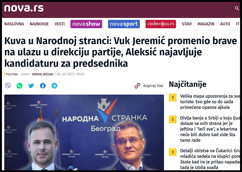 Šolakova „NovaS“ 03.07.2023. objavljuje tekst pod nazivom: „Kuva u Narodnoj stranci: Vuk Jeremić promenio brave na ulazu u direkciju partije, Aleksić najavljuje kandidaturu za predsednika“, u kome stoji: „Atmosfera u Narodnoj stranci je sve samo ne mirna, a to potvrđuje i najava potpredsednika Miroslava Aleksića da će se kandidovati za mesto predsednika. Smirivanju tenzija ne doprinosi ni priča da su na vratima Direkcije Narodne stranke u Njegoševoj 76 zamenjene brave, te da je nestao pečat“.