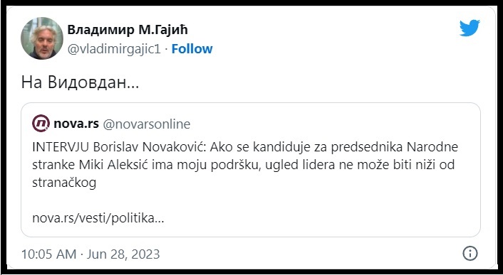 List „Politika“ je 28.06.2023. objavio tekst pod nazivom „Veliki sukob u Narodnoj stranci, Miroslav Aleksić i Vuk Jeremić u borbi za mesto predsednika“. U tom tekstu stoji: „Potpredsednik Narodne stranke Borislav Novaković izjavio je da će podržati kandidaturu Miroslava Aleksića za predsednika stranke 22. oktobra kada će biti održana Izborna skupština te partije. Tada će, na zahtev dve trećine odbora u Srbiji, biti birani svi stranački organi i predsednik Narodne stranke. Da je reč o sukobu za mesto lidera Narodne stranke, svedoči i poruka koju je poslao Vladimir Gajić šef Pravnog saveta Narodne stranke, njen potpredsednik i narodni poslanik. Gajić je uz Novakovićev intervju okačio komentar „Na Vidovdan…“, aludirajući da se radi o izdaji predsednika Narodne stranke Vuka Jeremića kome najbliži saradnici rade iza leđa. Uz Gajićevu objavu, stoji i komentar jednog od korisnika koji je za poteze Aleksića i Novakovića napisao komentar „Vuk Branković““.