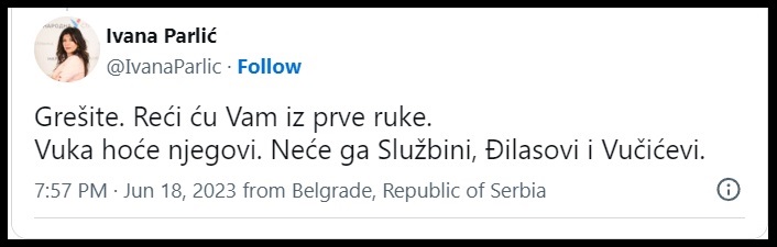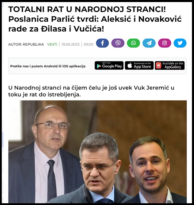 U toku je totalni rat i rat do istrebljanja u Narodnoj stranci. Poslanica Narodne stranke, Ivana Parlić (podržava Jeremića) je na Tviteru 19.6.2023. reagovala na tvrdnje o raskolu u Narodnoj stranci, pri čemu je optužila aleksićevce da rade za Službu, Vučića i Đilasa (?!). Ona je na Tviteru napisala: „Grešite. Reći ću Vam iz prve ruke. Vuka hoće njegovi. Neće ga Službini, Ðilasovi i Vučićevi“. Parlićeva jedino nije navela koji ljudi u Narodnoj stranci su Službini, koji su Vučićevi, a koji Đilasovi?