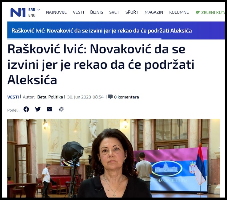 Portal TVN1, list „Danas“ i agencija „Beta“ su 30.6.2023. objavili tekst pod naslovom: „Rašković Ivić: Novaković da se izvini jer je rekao da će podržati Aleksića“. U tom tekstu stoji: „Potpredsednica Narodne stranke (NS) Sanda Rašković Ivić izjavila je da je njen stranački kolega Borislav Novaković napravio veliku grešku kada je rekao da će podržati šefa poslaničke grupe NS Miroslava Aleksića ako se kandiduje za stranačkog predsednika i da bi zbog toga trebalo da se izvini. „Ne znam šta mu je bilo da ovako postupi i da tako nešto izjavi. Pravo da vam kažem, gospodin Novaković je bio u dubokoj političkoj penziji, a upravo ga je (predsednik NS Vuk) Jeremić rehabilitovao. Očekujem njegovo izvinjenje i neku vrstu pokajanja za ovakav način ponašanja“, rekla je Rašković Ivić za list Politika. Navela je da „ako imamo pameti i savesti i ako želimo dobro stranci i srpskom društvu, treba da ostanemo jedinstveni, potrebno je da se apetiti smanje, da gledamo kako da menjamo stvari nabolje u društvu“.