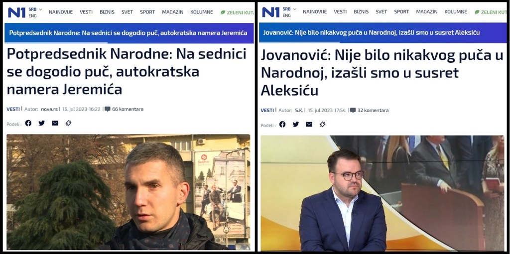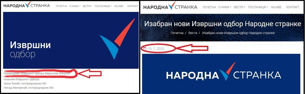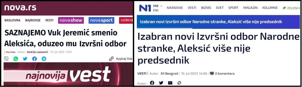 N1 i NovaS su 15.7.2023. objavili vest pod naslovom: „SAZNAJEMO Vuk Jeremić smenio Miroslava Aleksića, oduzeo mu Izvršni odbor“. U toj vesti između ostalog stoji: „Predsednik Narodne stranke Vuk Jeremić raspustio je Izvršni odbor te stranke na čijem je čelu bio Miroslav Aleksić. Naš sagovornik dodaje da je sednica Predsedništva Narodne stranke sazvana po jednom dnevnom redu, a da je potom taj dnevni red izmenjen posle koptiranja i stvaranja dvotrećinske većine u Predsedništvu u korist Vuka Jeremića“.