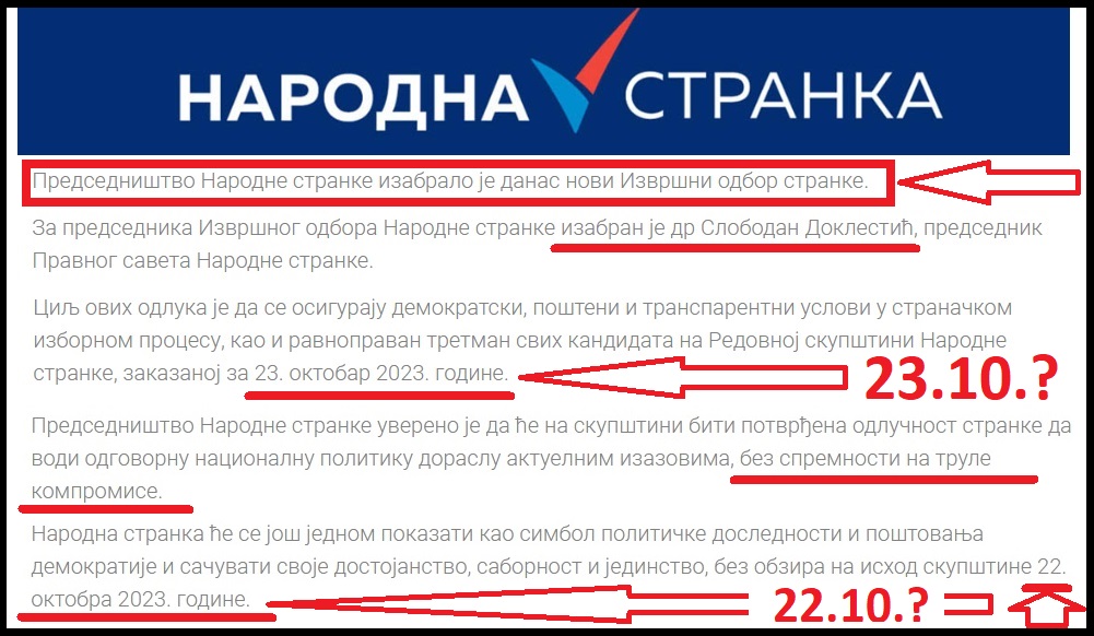 Iz ovog saopštenja se takođe nazire rasulo u kome se nalazi ova stranka. Prvo, u saopštenju stoje dva datuma održavanja Skupštine te stranke 22.10.2023. i 23.10.2023. Ranije je objavljeno da je ta skupština zakazana za 22.10. Izgleda da više ni ta stranka ne zna kada će da održi svoju izbornu skupštinu, toliki haos vlada. Stoga su u naveli dva datuma, ali ne namerno, već greškom. Drugo, ovim saopštenjem Vuk Jeremić udara šamarčinu Miroslavu Aleksiću i optužuje ga da je „spreman na trule kompromise“, dok on Jeremić želi „da vodi odgovornu nacionalnu politiku doraslu aktuelnim izazovima, bez spremnosti na trule kompromise“. Treće, advokat Slobodan Doklestić je bio član Srpske radikalne stranke, početkom 2000-tih. Tada je stvorio sajt SRS i brinuo o njegovom održavanju. Ovo je pozitivna promena u ponašanju Narodne stranke, koja je do sada na visoke funkcije imenovala islužene kadrove DS i DSS.
