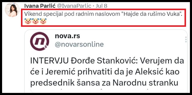 Ranije, 8.7.2023. narodna poslanica Jeremićeve stranke, Ivana Parlić optužila je na Tviteru Dragana Šolaka da nastavlja da ruši Narodnu stranku uz pomoć Aleksica i njegovih poslušnika! Ivane Parlić (podržava Jeremića) je reagovala na intervju na Šolakovoj NovaS, sa poslanikom Đorđem Stankovićem (podržava Aleksića) i na Tviteru je napisala: „Vikend specijal pod radnim naslovom „Hajde da rušimo Vuka““.
