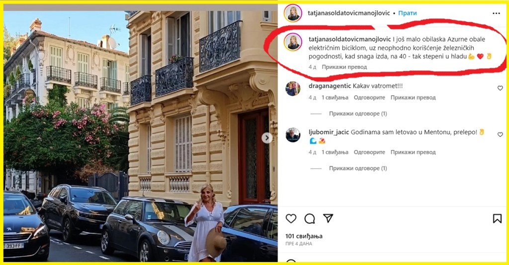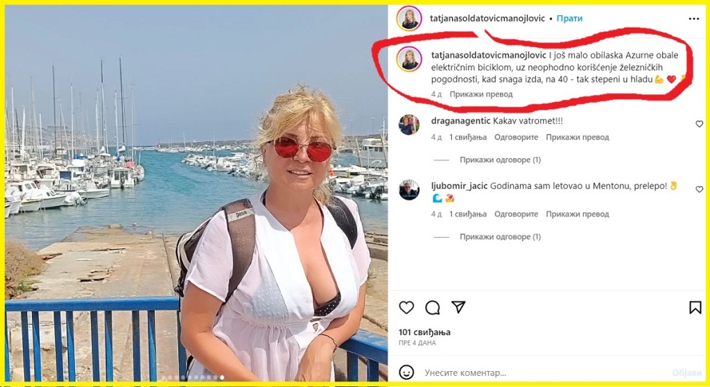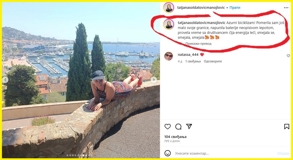 Uz svoje postove na „Instagramu“ elitna poslanica DS, potpredsednica DS i debelo plaćena urednica RTS je pisala sledeće licemerne i besramne komentare: „I još malo obilaska Azurne obale električnim biciklom, uz neophodno korišćenje železničkih pogodnosti, kad snaga izda, na 40 – tak stepeni u hladu💪❤️👌“, i „Azurni biciklizam! Pomerila sam još malo svoje granice, napunila baterije neopisivom lepotom, provela vreme sa društvancem čija energija leči, smejala se, smejala, smejala🥰🥰🥰“.