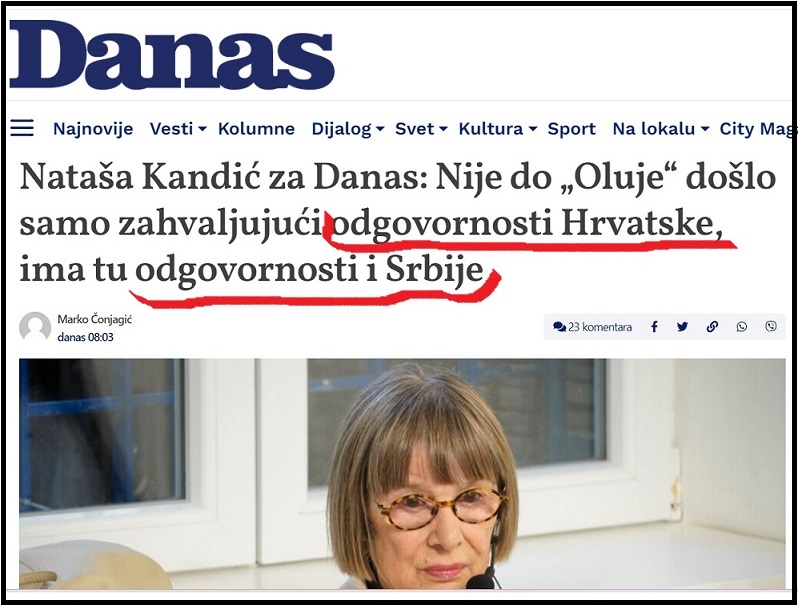 Uz to, na naslovnoj strani sajta „Danasa“ se nalazio sramni tekst, intervju sa Natašom Kandić, pod naslovom: „Nataša Kandić za Danas: Nije do „Oluje“ došlo samo zahvaljujući odgovornosti Hrvatske, ima tu odgovornosti i Srbije“. U tom intervjuu, Nataša Kandić, krivicu Hrvatske za to što je počinila jedan od najvećih zločina nad Srbima, najveće etničko čišćenje u istoriji savremene Evrope, pretvara u „odgovornost“. Uz to ona još sramotnije, uvodi „odgovornost“ Srbije i izjednačava je sa „odgovornošću“ Hrvatske! Nataša Kandić istovremeno optužuje Srbiju i Srpsku, da održavanjem komemorativnog skupa za žrtve “Oluje”, u Prijedoru, „pokazuju da nemaju dobrih namera“, optužujući srpski narod za zločine nad Bošnjacima i Hrvatima.