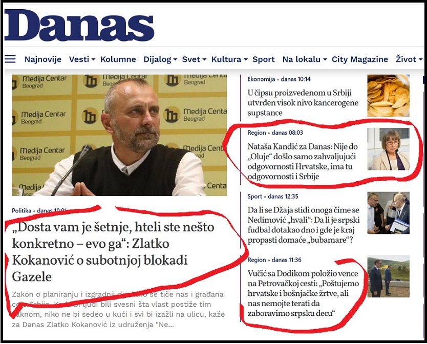 Na naslovnoj stranici sajta Šolakovog lista „Danas“ 4.8.2023., kao glavna vest stajao je tekst pod naslovom: „Dosta vam je šetnje, hteli ste nešto konkretno – evo ga“: Zlatko Kokanović o subotnjoj blokadi Gazele“. Glavna vest „Danasa“ je Ćutina leva ruka, Zlatko Kokanović zvani Sekirica, poznati nasilnik, koji je svojevremeno vitlao sekirom i pretio njome političkim neistomišljanicima. Sramno je da ova vest bude važnija od vesti o danu žalosti, o sećanju na srpske žrtve, na stradale u zločinačkoj hrvatskoj akciji „Oluja“.