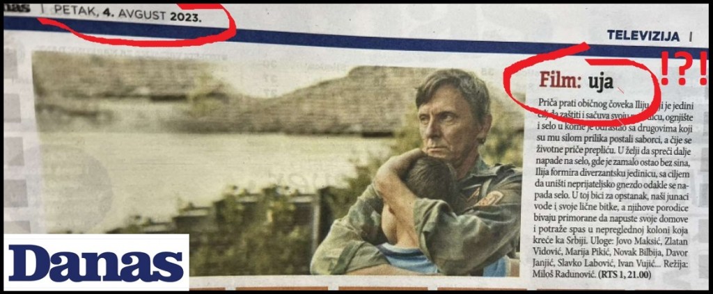 U štampanom izdanju Šolakovog lista „Danas“, baš 4.8.2023. pojavila se najava filma čiji je naziv „Oluja“, a koji je snimljen povodom jezive agresije nad Srbima. Međutim, umesto pravog naziva filma „Oluja“, novinari „Danasa“ su napisali i štampali „uja“. Kao, slučajno. Sasvim slučajno taj izraz se koristi kao jedan od sinonima za ustaše. Sramota!
