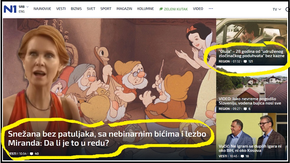 Na naslovnoj stranici sajta Šolakove TV N1, 4.8.2023. satima je stajala naslovna vest, glavna vest, sramotan tekst pod naslovom: „Snežana bez patuljaka, sa nebinarnim bićima i lezbo Miranda: Da li je to u redu?“. Pored ove glavne vesti, kao drugorazredna vest se nalazi vest o obeležavanju pomena žrtvama zločinačke „Oluje“. Šolakovoj televiziji N1, je važnija vest o „nebinarnim bićima, o patuljcima i o lezbo Mirandi“, nego vest o sećanju na srpske žrtve. Krajnje skaredno! U drugom delu dana, glavna vest je bila ona o slučaju kancerogenih materija u čipsu, koji se izvozi u Hrvatsku.