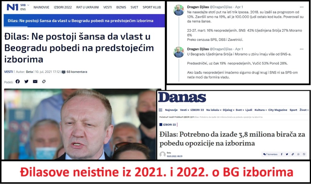 Dragan Đilas je u jednoj rečenici uspeo, prvo da slaže da mu je Vučić nešto obećao („Vučić nije slagao mene nego građane Srbije jer je njima javno obećao da će beogradski izbori biti raspisani u martu“), i potom, da u istoj rečenici prizna da je slagao („sakrivajući se iza rečenice – ako ih opozicija bude tražila“). Dakle, u drugom delu rečenice Đilas citira Vučića, koji je u vezi ponavljanja beogradskih izbora, po Đilasu rekao sledeće: „ako ih opozicija bude tražila“. Ovo što je Đilas rekao se poklapa sa onim što je predsednik Vučić rekao na istu temu, gostujući na TV Pink 17.4.2022., citiram Vučića: „ukoliko najveća opoziciona lista bude želela da ide na prevremene gradske izbore mi smo spremni“. Iz svega je jasno da predsednik Vučić, Đilasu nije ništa obećao, već je ostavio mogućnost da se beogradski izbori ponovo održe, ako to bude tražila opozicija, odnosno najveća opoziciona lista. Oko ponavljanja beogradskih izbora Đilasova koalicija nikada nije mogla da se dogovori, a kamoli cela opozicija. U daljem tekstu Đilas se još više upliće u svoju neistinu, objašnjavajući da veći deo opozicije neće izbore i kaže: „SSP ih je tražila. Jedina. Ostali su, verovatno zadovoljni svojim rezultatom, odbijali da traže izbore“. I iz ove Đilasove rečenice je jasno da predsednik Vučić nije ništa slagao, zbog toga što samo SSP traži samo beogradske izbore, a ostatak opozicije ne. Opozicija je nesložna i posvađana, i ne može da se dogovori ni oko jednog pitanja.