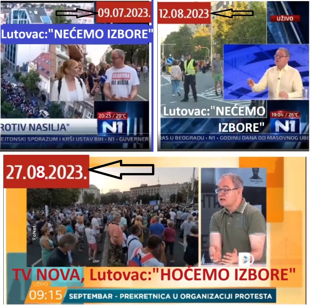 Karakterističan primer opozicione rašomonijade i kontradiktornih stavova, koji se menjaju iz nedelje u nedelju, su „fluidni“ stavovi predsednika DS, Zorana Lutovca. On je 09.07.2023. na TV N1 preteći rekao: „Izbori za nas nisu tema! Ako raspišu izbore, imaće građane na ulicama!“. Potom je Zoran Lutovac 12.08.2023. na TV N1, opet preteći rekao: „Ako raspišu izbore, imaće građane na ulicama i imaće kampanju sa građanima na ulicama! Imaće građansku neposlušnost, pobunu, štrajkove, blokade institucija!“. I konačno Lutovac je 27.08.2023. na TV NOVA, promenio stav i rekao: „Ulazimo u drugu fazu, tražimo vanredne izbore do kraja godine!“. Pogledajte snimak, veoma su upečatljiva Lutovčeva uplitanja u sopstvene kontradikcije.
