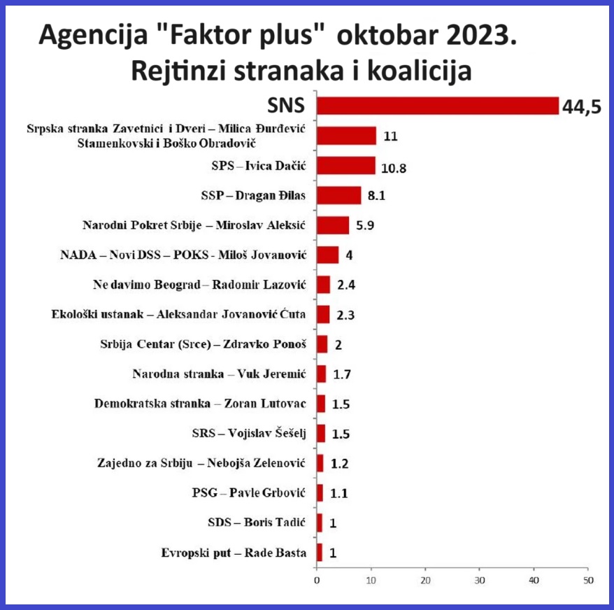Prvo ću prikazati istraživanje agencije „Faktor plus“. Istraživanje agencije „Faktor plus“ od 5. do 11.10.2023. Rejtinzi stranaka: IZNAD CENZUSA: SNS-44,5%; Zavetnici-Dveri-11%; SPS-10,8%; SSP-8,1%; NPS-5,9%; NADA-DSS-4%. ISPOD CENZUSA: NDBG-2,4%, Ćuta-2,3%; SrCe-2%; NS-1,7%; DS-1,5%; SRS-1,5%; Zajedno-1,2%; PSG-1,1%; SDS-1%; Basta-1%. Sve je tačno. Postoje dva iznenađenja za mene – rejting NPS i rejting Dveri i Zavetnika.