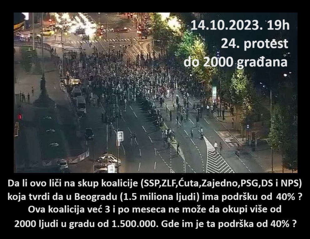 „Stata“ je u januarskom istraživanju 2022. u Beogradu prikazala da Đilasova koalicija „Ujedinjeni“ (SSP, NS, PSG, DS, i tri marginalna činioca koji se ne pojavljuju u istraživanjima) ima 28,2% u Beogradu. „Stata“ je u junskom istraživanju 2023. u Beogradu prikazala da stranke koje su činile „Ujedinjene“ imaju zajedno samo 23,2% – SSP 16,2%, PSG 4,1%, NS 2,9%. DS u junu nije pojedinačno prikazana u „Statinoj“ tabeli sa rejtinzima, zbog toga što DS ima rejting manji od pola procenta, što predstavlja statističku grešku. U tabeli „State“, van grafike, u kratkom tekstu je stoji da 5 stranaka – SRS, SDS, POKS, Zajedno i DS imaju ukupno 4,5%. Znamo da SRS ima 1,5%, SDS 1%, Zajedno ima 1,3%, što znači da POKS ima trećinu procenta, kao i DS, što je apsolutno marginalno. U junu, tj. u julu, kada je „Stata“ objavila junsko istraživanje, je na naplatu došao račun laži koja je objavljena u januaru 2022. Očigledno je da je januaru 2022. „Stata“, po Đilasovom nalogu preterala u drastičnom laganju o rejtingu Đilasove koalicije, a u junu 2023. „Stata“ se opredelila za manje drastičnu obmanu. Kao što vidite kada se uporede ta dva istraživanja „State“, činioci Đilasove koalicije u junu 2023. su imali tačno 5 odsto manje nego u januaru 2022. i to u Beogradu, koji je najveće uporište đilasovske koalicije. U januaru 2022. su imali 28,2 odsto, a u junu 2023. su imali 23,2 odsto. I taj rejting Đilasove koalicije od juna do danas u oktobra, u Beogradu, je mogao samo da ide naniže, a ne naviše. Da potkrepim to činjenicom da su protesti Đilasove koalicije u junu bili na vrhuncu, a da su drastično okopneli već u julu, avgustu, septembru i oktobru. Unazad tri i po meseca na proteste Đilasove opozicije u Beogradu, koje ne organizuje samo Đilosova koalicija, već i tri grupacije lažnih ekologa (Ćuta, Zelenović i Zeleno levi front), dolazi manje od 2000 ljudi.