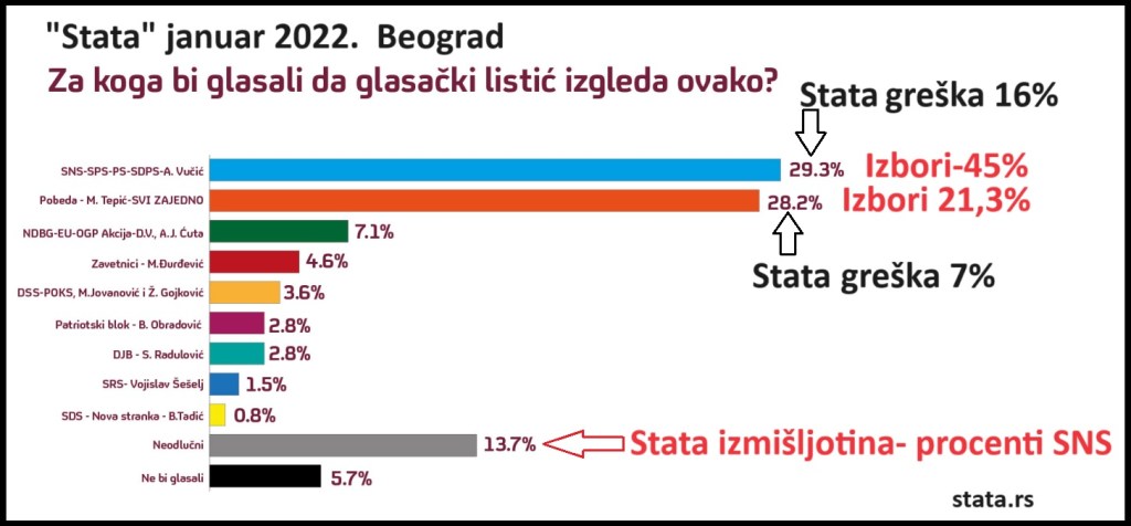 Kratko ću podsetiti na to sramno januarsko beogradsko istraživanje „State“, objavljeno 11.2.2022. u Šolakovim i Đilasovim medijima. Tada je „Stata“ predviđala da će SNS, SPS, PS, SDPS imati 29,3%, Đilasovi „Ujedinjeni“ 28,2%, Koalicija Zelenih (NDBG, Ćuta, ZZS)7,1%, Zavetnici 4,6%, NADA 3,6%, da Dveri-POKS neće preći cenzus (2,8%), DJB-2,8%, SDS-0,8%. „Stata“ je totalno promašila u predviđanju rezultata izbora za Skupštinu grada Beograda, i pokazala da se radi o lažnom istraživanju.„Stata“ je predviđala da će SNS i SPS imati 29,3% a dobili smo 44,9%. Promašaj „State“ od „samo“ 15,6%! „Stata“ je predviđala da će Đilasovi „Ujedinjeni“ imati 28,2%, a dobili su 21,3%. Promašaj „State“ od „samo“ 7%. „Stata“ je predviđala da opozicija pobeđuje u Beogradu i preuzima vlast, a dogodilo se obrnuto.