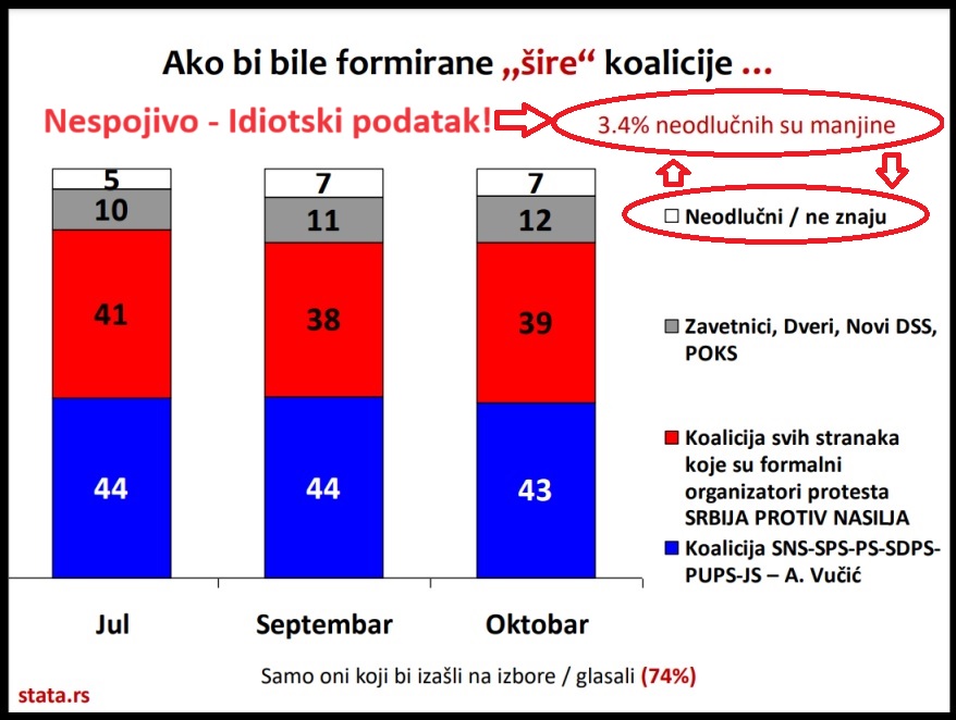 Četvrta velika obmana „State“ se odnosi na tabelu o širim koalicijama. Naime, „Stata“ prikazuje da „Koalicija svih stranaka koje su formalni organizatori protesta „Srbija protiv nasilja““ ima 39% podrške. Međutim „Stata“ je stalno se uplićući u sopstvene laži, zaboravila da zbir rejtinga tih stranaka (SSP 8,6%, NPS 7,7%, Zeleno levi front 3,8%, Ekološki ustanak 3,5%, PSG1%, Zajedno 1,3%, DS 0,3%) koje je prikazala u tabeli pojedinačnih rejtinga iznosi 26,2%, što je 13% manje od 39% iz tabele o širim koalicijama. Kolosalna laž. „Stata“ hoće da poverujemo da bi te đilasovske stranke dobile 13% više ukoliko zajedno nastupe na izborima. Kolosalna neistina. Efekat koalicione sinergije, nikada ne može biti toliki. Drugo, ukoliko na te stranke primenimo princip koalicione sinergije, taj princip bi morali da primenimo i na vladajuću koaliciju koju „Stata“ naziva „SNS, SPS, SDPS, JS, PS, PUPS“. U tabeli rejtinga pojedinačnih stranaka „State“ SNS ima 36,6% a SPS 7%. Ukupno je to 43,6%. U tabeli širih koalicija, te dve stranke imaju po „Stati“ 43%, što je manje od pojedinačnog rejtinga te dve stranke. Neverovatno. Gde je sinergijski efekat vladajuće koalicije, koji je dat đilasovskim strankama? Nema ga! Zbog čega? Rekо` Đilas. Takođe, taj ogroman sinergijski efekat koalicije „Stata“ je oduzela i desnici (Dveri, Zavetnici, DSS, POKS), koji u tabeli pojedinačnih rejtinga imaju 10,5% (Dveri 3,9%, Zavetnici 3,4%, DSS 3,1%, POKS 0,3%), a u tabeli širih koalicija samo 12%. Poseban idiotizam u tabeli širih koalicija predstavlja podatak, citiram „Statu“: „3,4% neodlučnih su manjine“. U tabeli širih koalicija „Stata“ prikazuje da ima 7% neodlučnih, a iznad tog podatka piše navedeni idiotizam. „Stata“ je verovatno želela da kaže da polovina od 7% neopredeljenih, u stvari predstavlja manjine. Tako su morali i da prikažu u tabeli, a ne da pišu gluposti, jer 3,4% od 7%, nije polovina, nego 1/30. Takođe, neopredeljeni su jedna kategorija u istraživanju, a manjine sasvim druga kategorija. Opet idiotska brljotina.