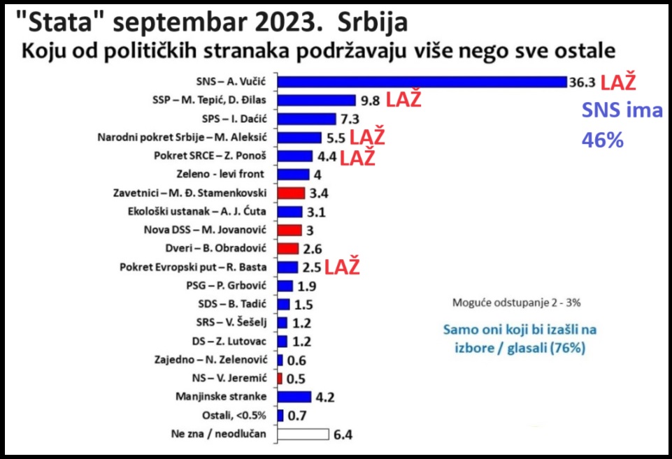 Stare neistine i obmane „State“ prisutne u ranijim istraživanjima, ponavljaju se. Kako je „Stata“ Đilasova agencija, ona protežira antivučićevske prozapadne stranke. „Stata“ je SNS veštački spustila na 36,6%. Istina je da SNS-u rejting raste, a ne opada. Međutim, Đilas kaže „Stati“ da ima da prikaže pad rejtinga SNS, pa „Stata“ posluša. Argumenti u prilog toj mojoj tvrdnji o rastu rejtinga SNS, su uspešna državna politika Vučića i SNS, rast plata i penzija, smanjenje inflacije, a sa druge strane, propali su protesti opozicije, opozicione stranke se raspadaju i svađaju – Narodna stranka se raspala i iznedrila NPS i ranije SrCe, raspala se stranka „Zajedno“, POKS se ranije raspao na tri dela, opozicija ne može da se dogovori kada i koje izbore želi, niti u kakvim koalicijama će nastupiti na izborima. Rejting SNS je na nivou od 45-46%. To potvrđuje najnovije istraživanje agencije „Faktor plus“ iz oktobra meseca 2023. (SNS 44,5%) i rezultati izbora 2022. (SNS 44,3%). „Stata“ je veštački umanjila rejting SNS za oko 9%. Smanjila je i rejting SPS-JS za oko 3%. Agencija „Stata“ je u oktobru, po Đilasovom nalogu, posegla za velikim lažima. Osim uzimanja postotaka vladajućim strankama, „Stata“ je prikazala i 3 drastično lažna podatka: 1.NPS-Aleksić-7,7%. 2.Pokret Srce-Ponoš-4.3%. 3. Ostale stranke-11%. Prvo, novoformirana Aleksićeva stranka, koja nije postojala do pre 3 meseca, ne može da ima 7,7%, što bi je činilo drugom najjačom opozicionom strankom, gotovo jednakoj Đilasovoj stranci SSP (8,6% po „Stati“). Većina građana u Srbiji ne zna da NPS postoji. Aleksić je prisutan samo u Šolakovim medijima, a njihov domet je ograničen. Rejting Aleksića i NPS je odredio Đilas. Slična, ali manje drastična primedba, važi i za rejting Ponoševe stranke. Treće, „Stata“ je prvi put prikazala da ostale stranke, koje ne prelaze cenzus, imaju 11% ukupno. To je čudan podatak, s obzirom da nije naveden broj tih stranaka, niti koliko svaka od tih stranaka ima pojedinačno. Ranije je „Stata“ objavljivala procente svih stranaka koje ne prelaze cenzus. U ovoj brojci od 11% krije se deo oduzetog procenta SNS. Koje su to stranke koje po „Stati“ ne prelaze cenzus? To su „Evropski put“-Basta-1%, PSG-1%, SDS-1%, Zajedno-1,3%, DS-0,3%, SRS-1,5%, Narodna stranka-1,7%, „POKS“-0,3%, „DJB-Suverenisti“ 0.5%. To su stvarni rejtinzi tih stranaka. Ukupno tih 9 stranaka ima oko 8% a ne 11%. Da sumiram, agencija „Stata“ je veštački spustila stranke vlasti za preko 12%. Istovremeno je „Stata“ veštački podigla rejting svojih miljenika iz prozapadne opozicije za oko 5,5% , i veštački podigla zbirni procenat stranaka koje ne prelaze cenzus sa 8% na 11%.