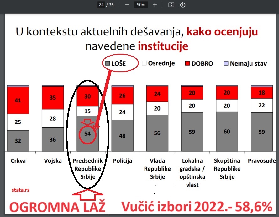 Po „Stati“ ugled predsednika Srbije je 2023. za 8% veći nego 2011. Po „Stati“ ugled Vlade Srbije je 2023. (24%) tj. tri puta veći nego 2011. (8%)! Po „Stati“ ugled Skupštine je četiri puta veći 2023. (20%) nego 2011. (5%). Naravno, celo ovo istraživanje je laž, zbog toga što je ugled svih institucija mnogo veći danas, 2023. godine, nego što prikazuje agencija „Stata“. Najveći besmisao ovog dela istraživanja se vidi po pitanju ugleda predsednika Srbije. U tabeli na strani 24 „Stata“ prikazuje da 54% građana ima LOŠE mišljenje o predsedniku Republike, da 15% ima OSREDNJE mišljenje, a da 30% ima DOBRO mišljenje. Besmisao i obmana „State“ se sadrži u činjenici da smo 2022. godine imali predsedničke izbore na kojima je 58,6 odsto građana glasalo za predsednika Vučića, što znači da gotovo 60 odsto građana ima DOBRO mišljenje o predsedniku Vučiću, a ne samo 30 odsto. Dakle, „Stata“ je slagala, i prepolovila podatak o tome da 60% građana ima DOBRO mišljenje o predsedniku Vučiću. U suštini prepolovili su rejting predsednika Vučića.