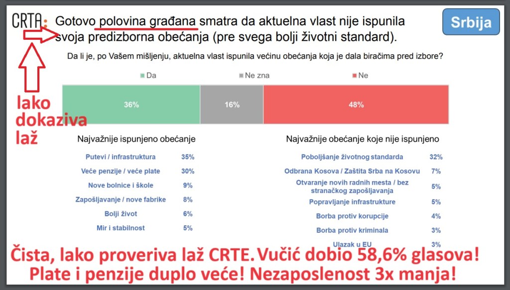 1. Tvrdnja broj 1. CRTE je očigledna neistina. Da zaista „polovina građana, njih 47 odsto, smatra da se Srbija kreće u pogrešnom pravcu“, ne bi 58,6% građana glasalo za predsednika Vučića.