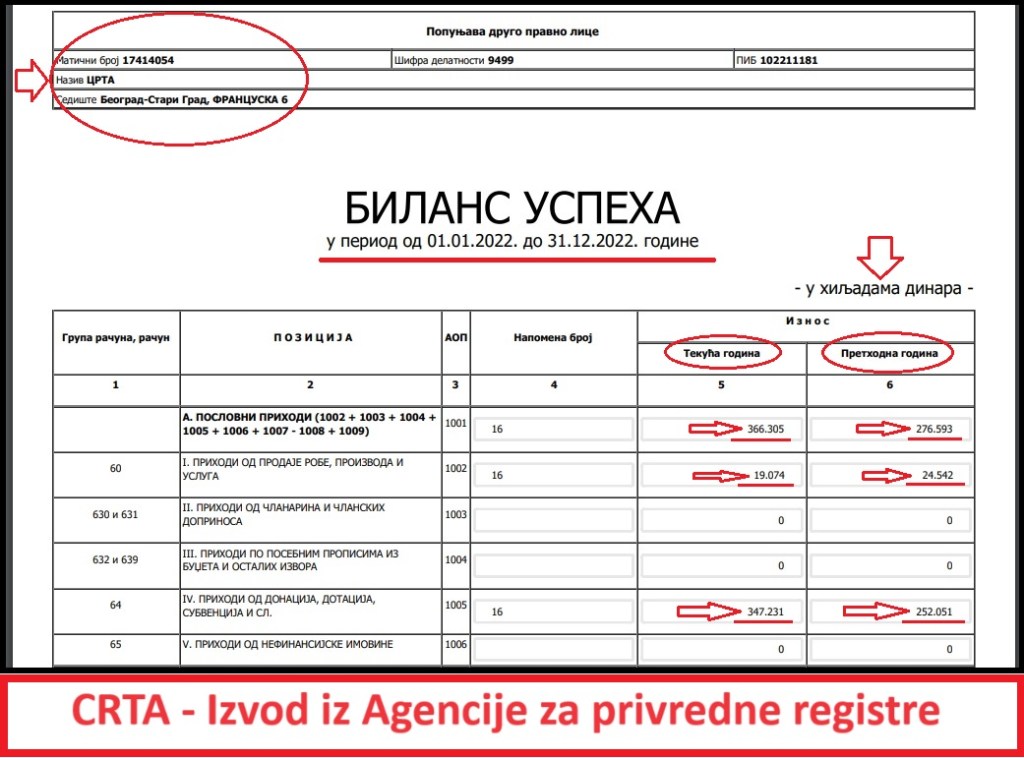 Privatnu nevladinu organizaciju CRTA finansira čitav klaster zapadnih država i organizacija: Evropska unija, EU u Srbiji, Fond Rokfeler, USAID, Švedska, Holandija, Švajcarska, Kanada, Češka, Luksemburg, ambasade Nemačke i Britanije, nemačka fondacija Fridrih Nauman, „Nemačka saradnja“ Srbija (Deutsche Zusammenarbeit). Pregledom podataka u Agenciji za privredne registre, ustanovio sam sledeće šokantne podatke. U APR-u stoji da CRTA ima čak 46 računa u bankama (vide se brojevi svih 46 računa u bankama). Zastupnici CRTE su Vukosava Crnjanski i Raša Nedeljkov. Uvidom u finansijski izveštaj CRTE, „bilans uspeha“ za period od 1.1.2022. do 31.12.2022. ustanovio sam da je CRTA u 2022. godini dobila 347.231.000 din. (347 miliona dinara) ili 2,9 miliona evra „donacija, dotacija i subvencija“ sa Zapada! Neverovatno! U izveštaju APR stoji da je CRTA 2021. godine, dobila 252.051.000 din. (252 miliona dinara) ili 2,1 milion evra sa Zapada. U izveštaju APR stoji da je CRTA 2020. godine, dobila 297.369.000 din. (297 miliona dinara) ili 2,5 miliona evra sa Zapada. U izveštaju APR stoji da je CRTA 2019. godine, dobila 229.760.000 din. (229 miliona dinara) ili 1,9 miliona evra sa Zapada. U izveštaju APR stoji da je CRTA 2018. godine, dobila 171.518.000 din. (171 milion dinara) ili 1,42 miliona evra sa Zapada. APR ne nudi pretragu za godine pre 2018. Dakle, CRTA je za 5 godina, od 2018. do ove godine, dobila neverovatnih 10,8 miliona evra sa Zapada! CRTA dobija neverovatan, ogroman novac sa Zapada. Na šta CRTA troši toliki novac? Na plate? Na borbu protiv države Srbije? Na borbu protiv predsednika Srbije, Aleksandra Vučića? Da li zapadni finansijeri CRTE znaju da CRTA troši novac njihovih poreskih obveznika, na lažna i neprofesionalna istraživanja? U nekim od zapadnih zemalja, koje finansiraju CRTU, objavljivanje lažnih istraživanja je kažnjivo zakonom. Da CRTA radi na zapadu, ovako kako radi u Srbiji, njena odgovorna lica bi bila optužena, osuđena i u zatvoru. Srbija je veoma tolerantna zemlja. Živela Srbija!