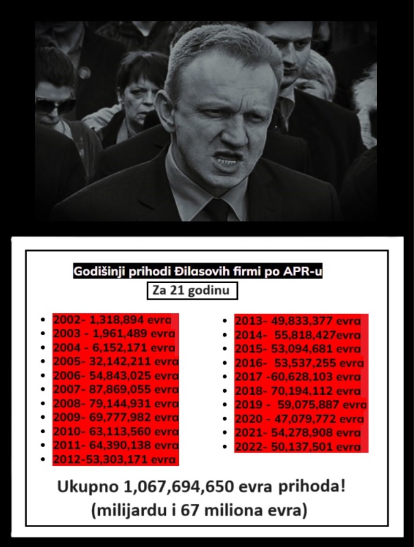 U arapskoj knjizi „Hiljadu i jedna noć“, postoji priča „Ali Baba i 40 razbojnika“. Dragan Đilas je nadmašio Ali Babu. Đilas je imao čak 56 razbojnika. Svi su hapšeni, pod optužbama za različita krivična dela. Ne smemo zaboraviti da se Dragan Đilas, nalazi među 10 najbogatijih Srba današnjice. Sumnja se da se obogatio, putem zloupotrebe službenog položaja, i trgovine uticajem. Đilas je od 2004. do 2013. obavljao 3 državne funkcije: Direktor kancelarije bivšeg predsednika Borisa Tadića, ministar za NIP, gradonačelnik Beograda. U periodu od 2004. do 2013. godine Đilasove kompanije su zaradile 619 miliona evra. Prihodi 11 firmi Dragana Đilasa, koje je sam prijavio APR-u, za 21 godinu (od 2002. do 2022.) su milijardu i 67 miliona evra (1.067.000.000evra). U julu 2019. je ministar policije potvrdio da se protiv Đilasa vodi istraga zbog sumnje da je umešan u pljačku RTS. Đilas je 10 godina uzurpirao i privatizovao garažu koja pripada Gradu Beogradu i Parking servisu. Đilas je vršio porodično nasilje. Pored porodičnog nasilja, Đilas je, po svedočenju njegovog bivšeg potpredsednika stranke, poslanika Dejana Bulatovića, krvnički tukao svog psa, na Bulatovićevom imanju. Sve je posmatrala prestravljena i uplakana Đilasova ćerka.
