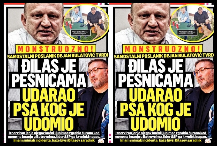 Bivši Đilasov potpredsednik SSP, samostalni poslanik Dejan Bulatović svedočio je u medijima kako je Dragan Đilas krvnički pretukao svog psa. Đilasov skandal se dogodio u leto 2021. godine, na imanju Dejana Bulatovića u selu Batrovcima, gde je Đilas došao u goste na trešnje, sa ćerkom, na poziv Bulatovića. U voćnjaku je Đilasov pas, nenavikao na domaće životinje, napao živinu. Po svedočenju poslanika Bulatovića, Đilas je uhvatio psa i počeo krvnički da ga tuče pesnicama u glavu. Sve to je posmatrala užasnuta Đilasova ćerka. Evo šta kaže Dejan Bulatović: „Đilas nesrećnu životinju udarao pesnicom po glavi. Ćerka ga je molila da prestane, dobila je slom živaca, mnogo je loše izgledala. I sam sam ga opominjao da prestane. Pas je napao ćurana, dešava se to, a i ćuran je živ, ali on je bio toliko ljut i besan i iživljavao se. Ajde što mene nije čuo, ali ćerku… Psa je bukvalno prebio. Imam snimak svega toga. Dragan nema empatiju prema ljudima i životinjama. On koristi ono što je popularno, a sad je to briga o životinjama, pa se hvali da ih i on voli, a nije tako“. To sam i ja tvrdio. Dragan Đilas je udomio tog psa 2020. godine, u vreme Korone, da bi mogao da izlazi u vreme karantina. Đilas se po Šolakovim medijima i društvenim mrežama hvalio da ima psa i mačku, prikazujući se kao veliki ljubitelj životinja. Ni pas ni mačka ga ne zanimaju. Poseduje ih zbog samoreklame, i zbog toga da niko ne može da kaže, da nema ni kučeta, ni mačeta. Ima. Istina je da ni jedno ljudsko biće ne želi da živi sa Đilasom.