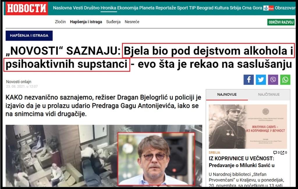 Dragana Bjelogrlića je ugledni kolega, režiser, Predrag Antonijević, optužio da je korumpirani lažov. Uz to je Antonijević priložio i dokaze o tome kako je Bjelogrlić želeo da proneveri stotine hiljada evra, koje bi mu dodelio „Filmski centar Srbije“, i komisija čiji je član bio Antonijević. Antonijević tvrdi da mu je Bjelogrlić predložio da pronevereni novac podele. Dragan Bjelogrlić je 23.8.2021., bez povoda krvnički prebio svetski priznatog režisera Predraga Gagu Antonijevića, koji se usudio, kao niko, da snimi film o genocidu u Jasenovcu. Bjelogrlić je dok je udarao Antonijevića, vikao i „Je*ala te Dara iz Jasenovca”. Bjelogrlić je više od deset puta pesnicom u glavu udario nemoćnog Antonijevića, koji se nije branio. Gaga Antonijević je tada svedočio i sledeće: „Katarina Radivojević je pritrčala Bjelogrliću i rekla: ’Nemoj, i ja bih ga ubila’”. Odmah je na Bjelogrlićevu stranu stala celokupna Šolakova medijska mašinerija i pripadnici „elite”. Svi oni su ovo nazvali kafanskom tučom, pokušavajući da umanje nasilje svog štićenika Bjelogrlića. I svi su horski lagali da je Antonijević provocirao Bjelogrlića. Bjelogrlića su podržali novinari Slaviša Lekić, Slobodan Stupar i Antonela Riha, rekavši („Ruka mu se pozlatila”) i („Malo ga je izudarao, neki bi rekli nedovoljno. Malo ga je išamarao!”) i („Kafanska tuča”), i glumci Mima Karadžić, Marko Živić, i mnogi drugi pripadnici „elite“. Mediji su objavili podatak da je Bjelogrlić imao 1.15 promila alkohola u organizmu, kada je pretukao Antonijevića.